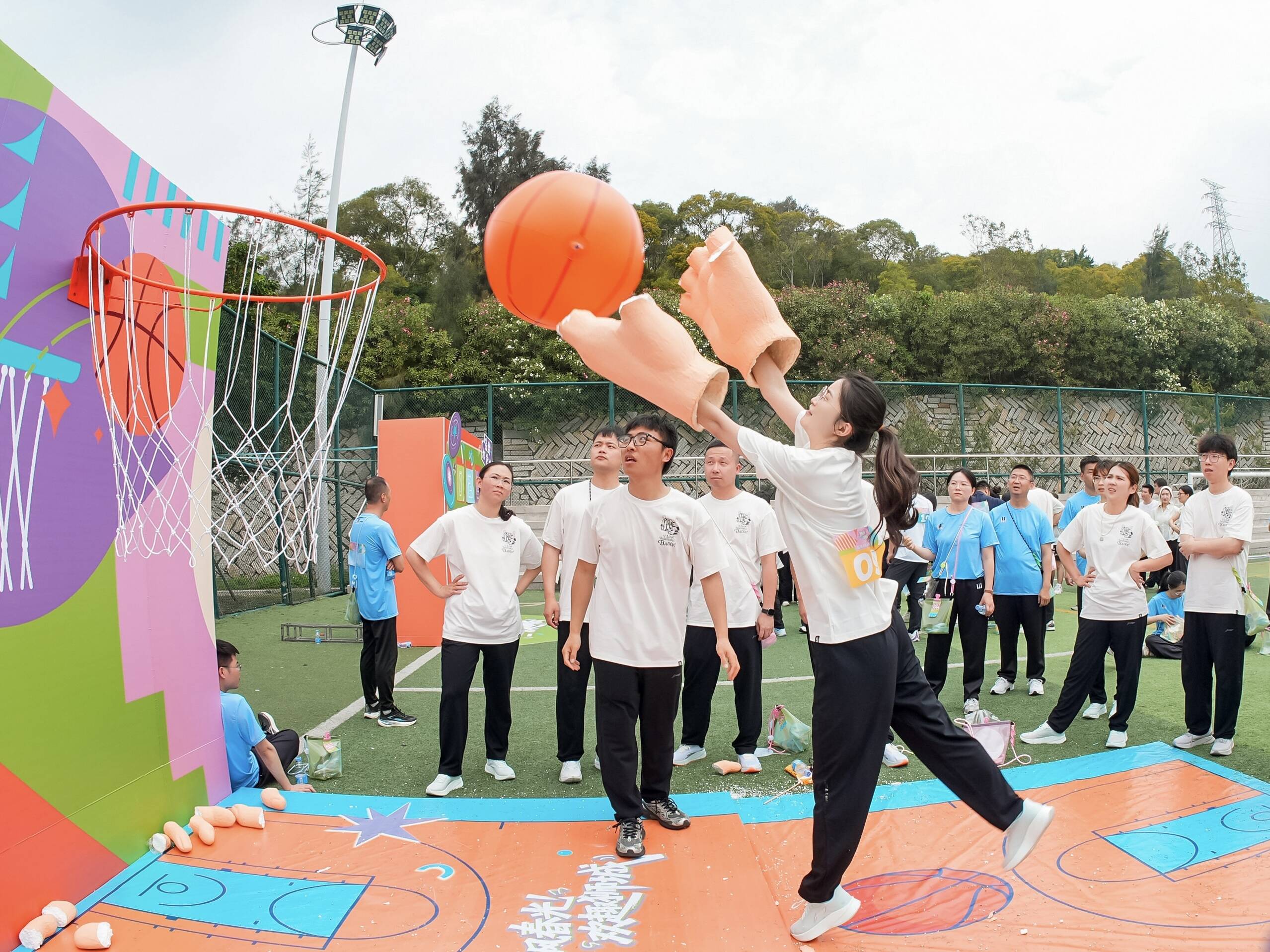运动会设置了丰富多元的赛事环节,既有考验团队默契的巨型篮球、飞盘九宫格、扭扭车大比拼、多向拔河四个团队项目,也有飞盘个人赛,兼顾了竞技性、趣味性与参与性。赛场之上,欢呼呐喊声此起彼伏,参赛队员们奋勇争先,在团队项目中彼此信任、默契配合,在个人项目中全力冲刺、挑战自我,每一场比拼都洋溢着活力与欢笑。