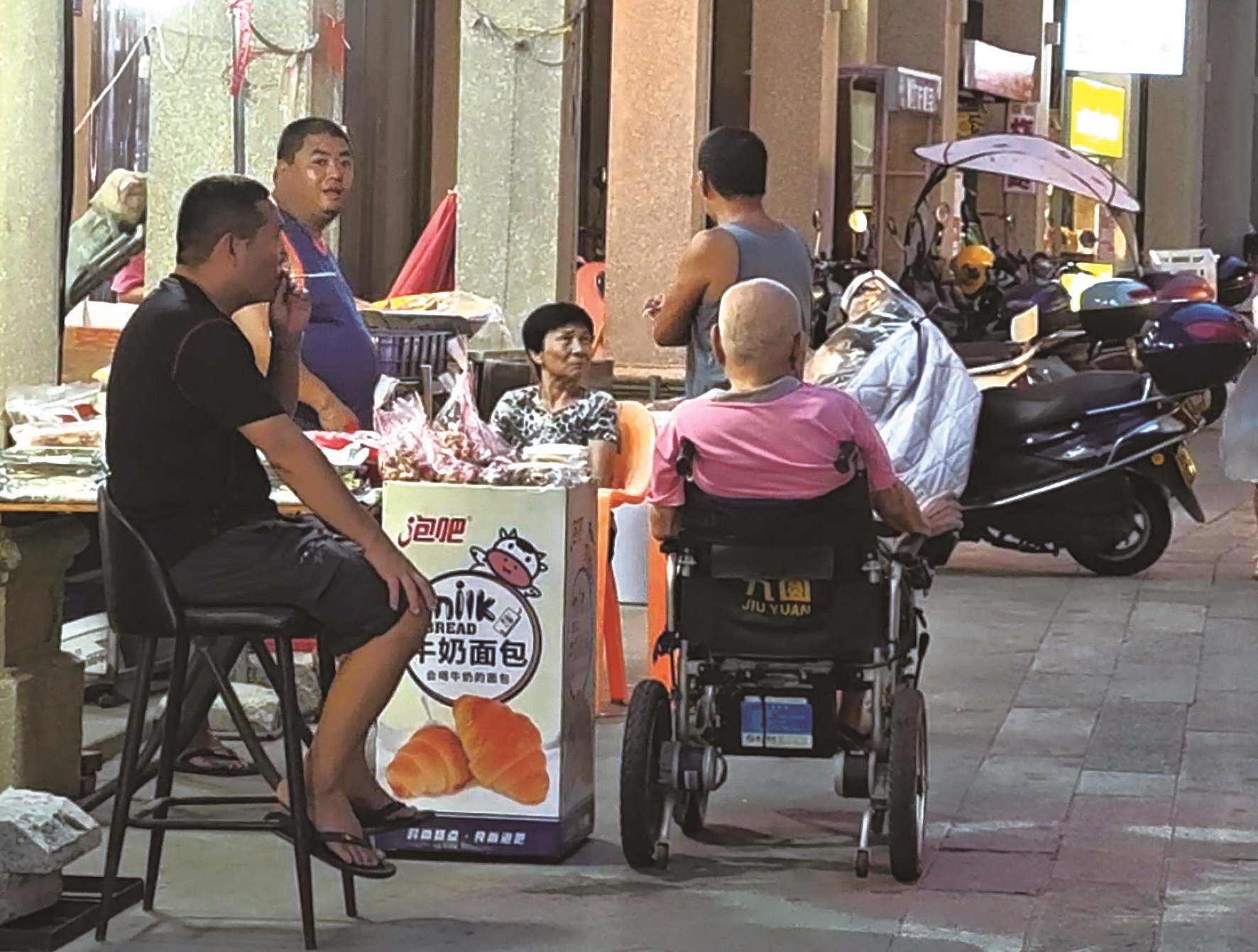 国庆节假期,在热闹的八卦街夜市里,笔者有一个小小的发现,觉得颇值得一提,那便是,“轮椅族”也来逛八卦街了:在一处摊位前,一位开电动轮椅的老人停下来与老街坊攀谈;不远处,一位开电动轮椅的中年妇女独自悠闲地逛着;在庙前广场,一位年轻的电动轮椅使用者在认真观看民俗文化表演……