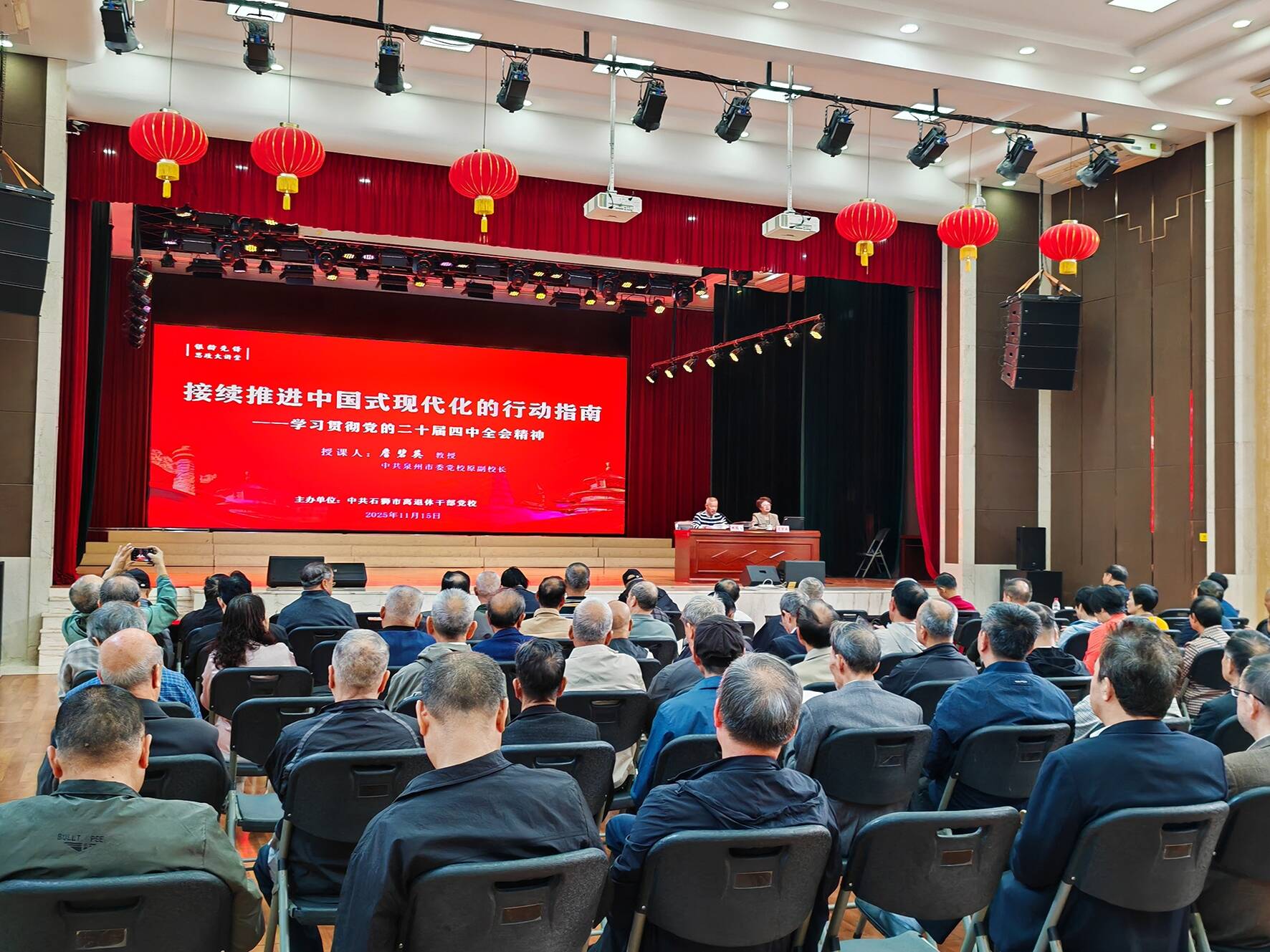 近日,由中共石狮市离退休干部党校主办的“银龄先锋思政大讲堂”在市老干老龄活动大厦礼堂开讲,专题学习贯彻党的二十届四中全会精神。活动邀请泉州老年大学副校长、市委老干部党校副校长詹碧英教授作专题讲座,全市各领域100余名老干部、老党员参加学习。