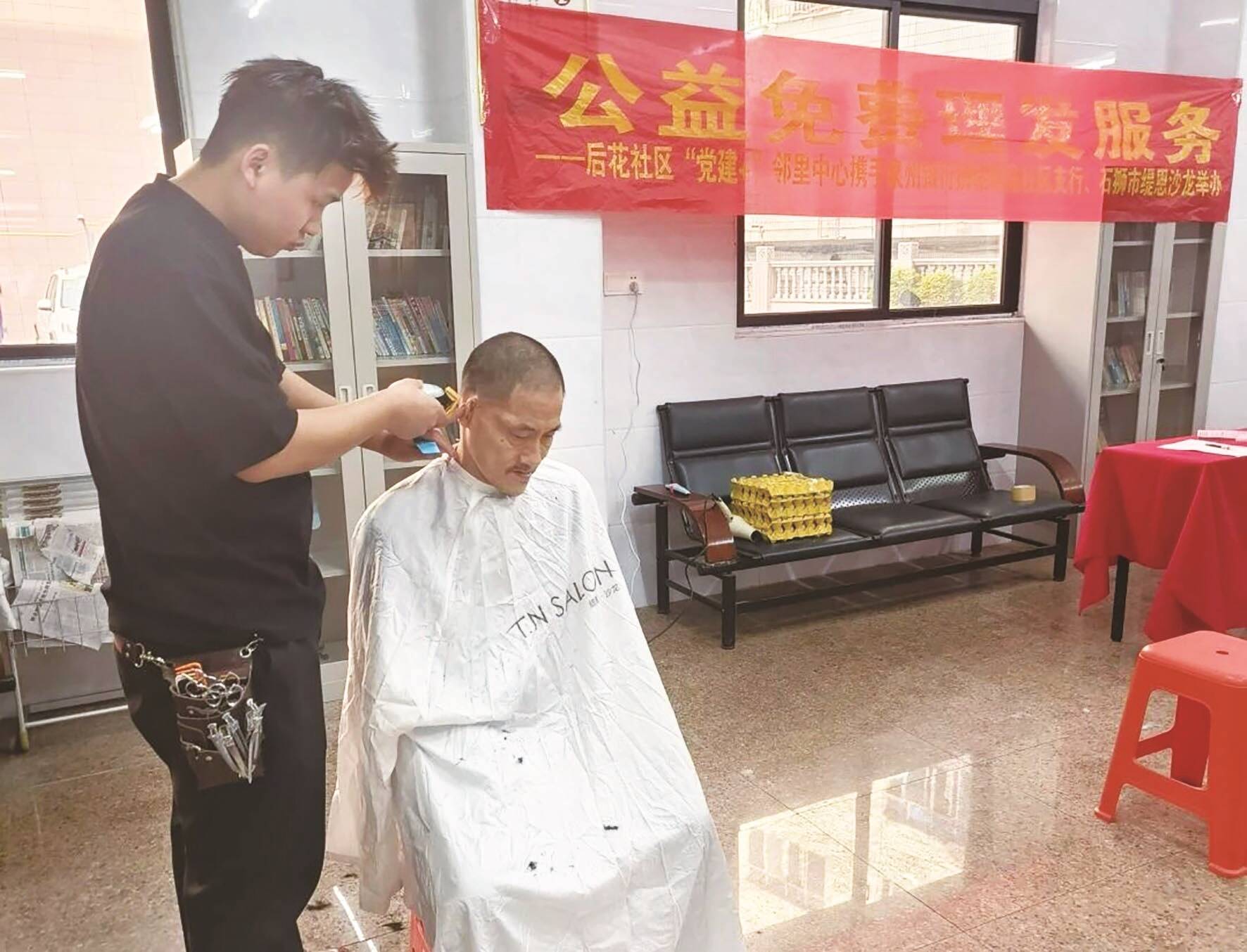 近日,凤里街道后花社区“党建+”邻里中心充分发挥服务阵地作用,联合泉州银行狮城帝苑社区支行共同举办公益义剪活动,特邀石狮市缇恩沙龙的义剪理发师团队,为辖区居民送上便捷贴心的便民服务。