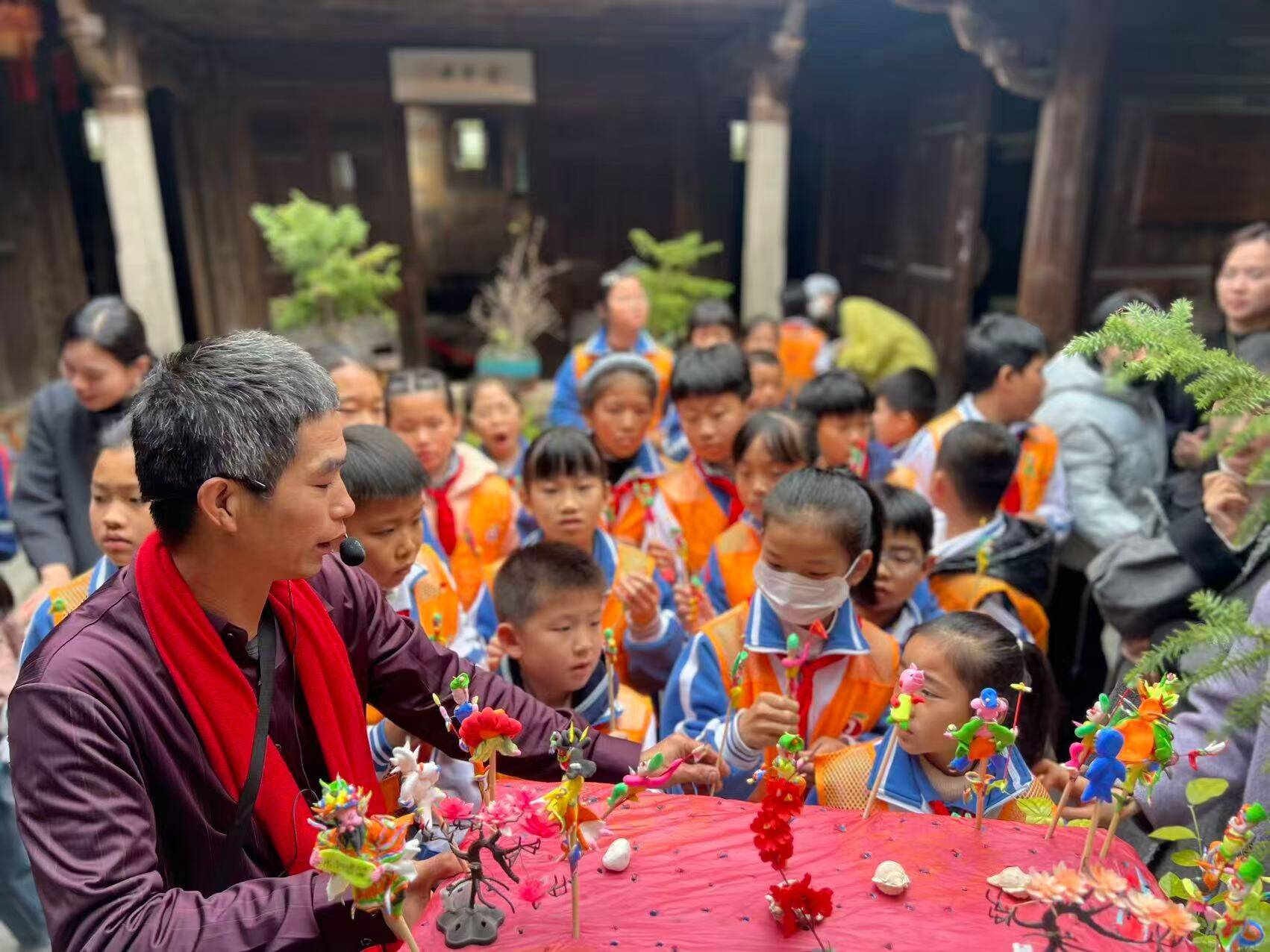 随后,他们在“上学堂”开展学习非遗妆糕人研学活动。摆动的孙悟空、栩栩如生的“马上发财”……学生们认真听取永宁雷氏妆糕人继承者雷芳兴讲解妆糕人历史与制作细节,并在老师的指导下学习制作妆糕人。