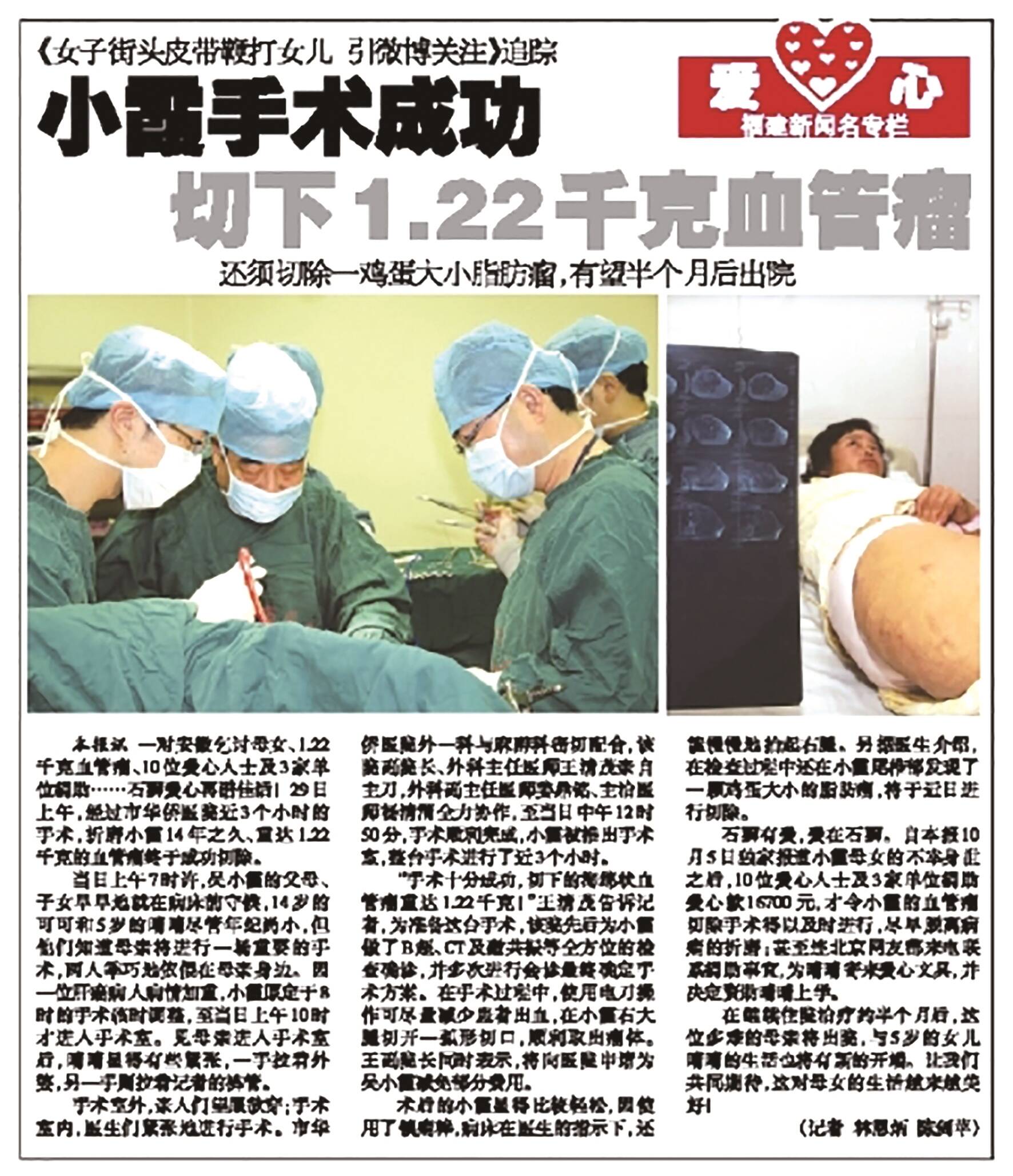 2011年10月29日,在社会各界爱心人士及单位的共同帮助下,折磨吴小霞十年、重达1.22千克的血管瘤经手术成功切除。(2011年10月31日《石狮日报》相关报道截图)