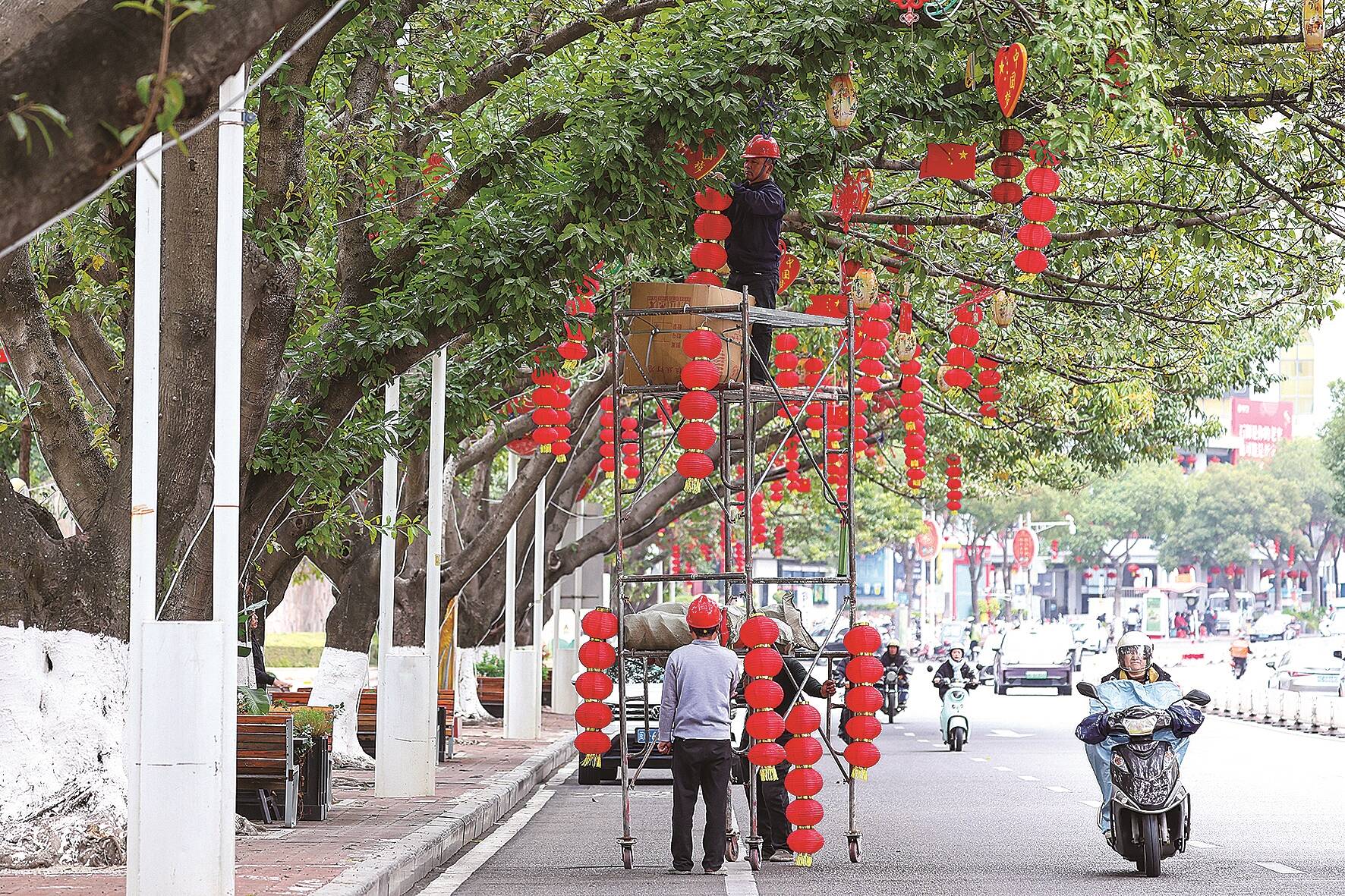 大红灯笼高高挂,张灯结彩迎新春。随着马年春节的临近,我市各主干道也陆续换上“新年盛装”——寓意丰富的大红灯笼在行道树枝头高高悬挂,浓浓的年味一下子弥漫开来。1月29日,记者在八七路人民广场段看到,工人爬上脚手架,将一串串喜庆的灯笼挂满枝头,象征吉祥安康、幸福团圆的红灯笼随风摇曳、多姿多彩,为石狮这座城市增添了欢乐祥和、福气满满的节日喜庆氛围。