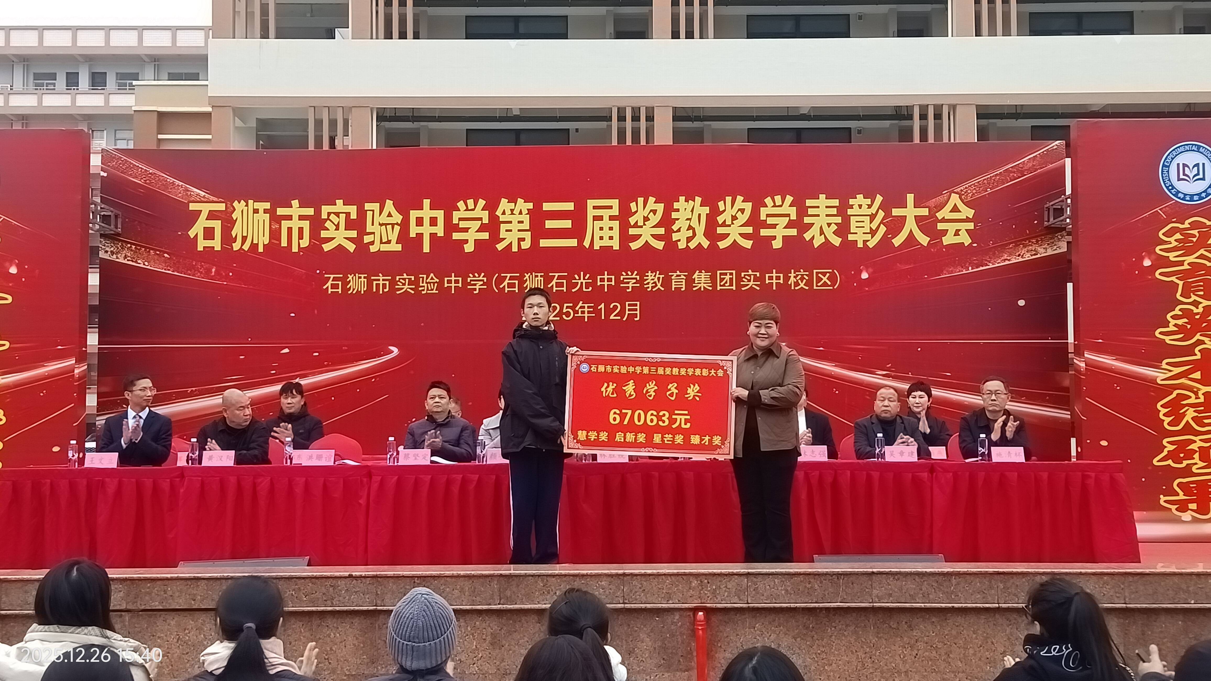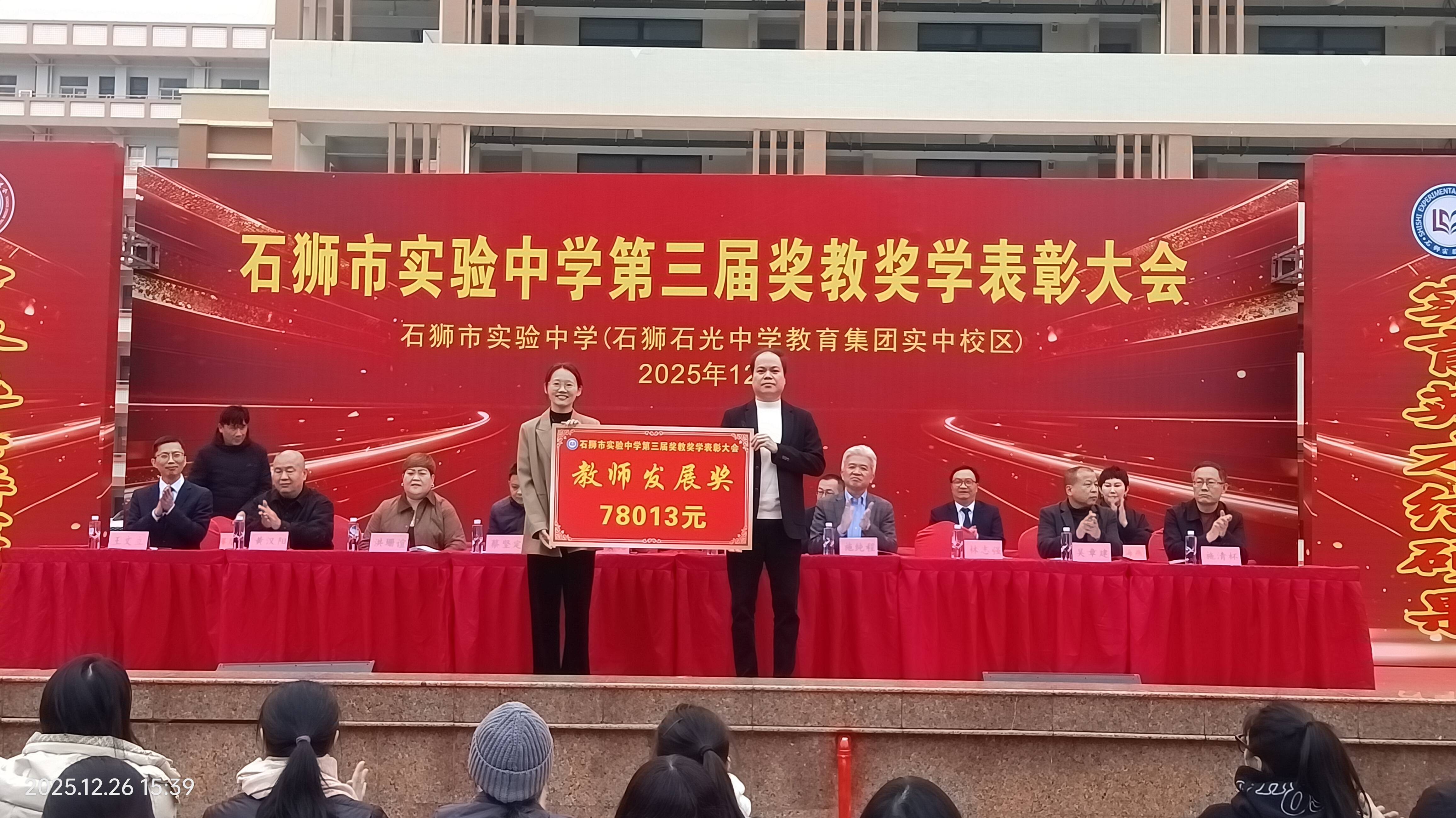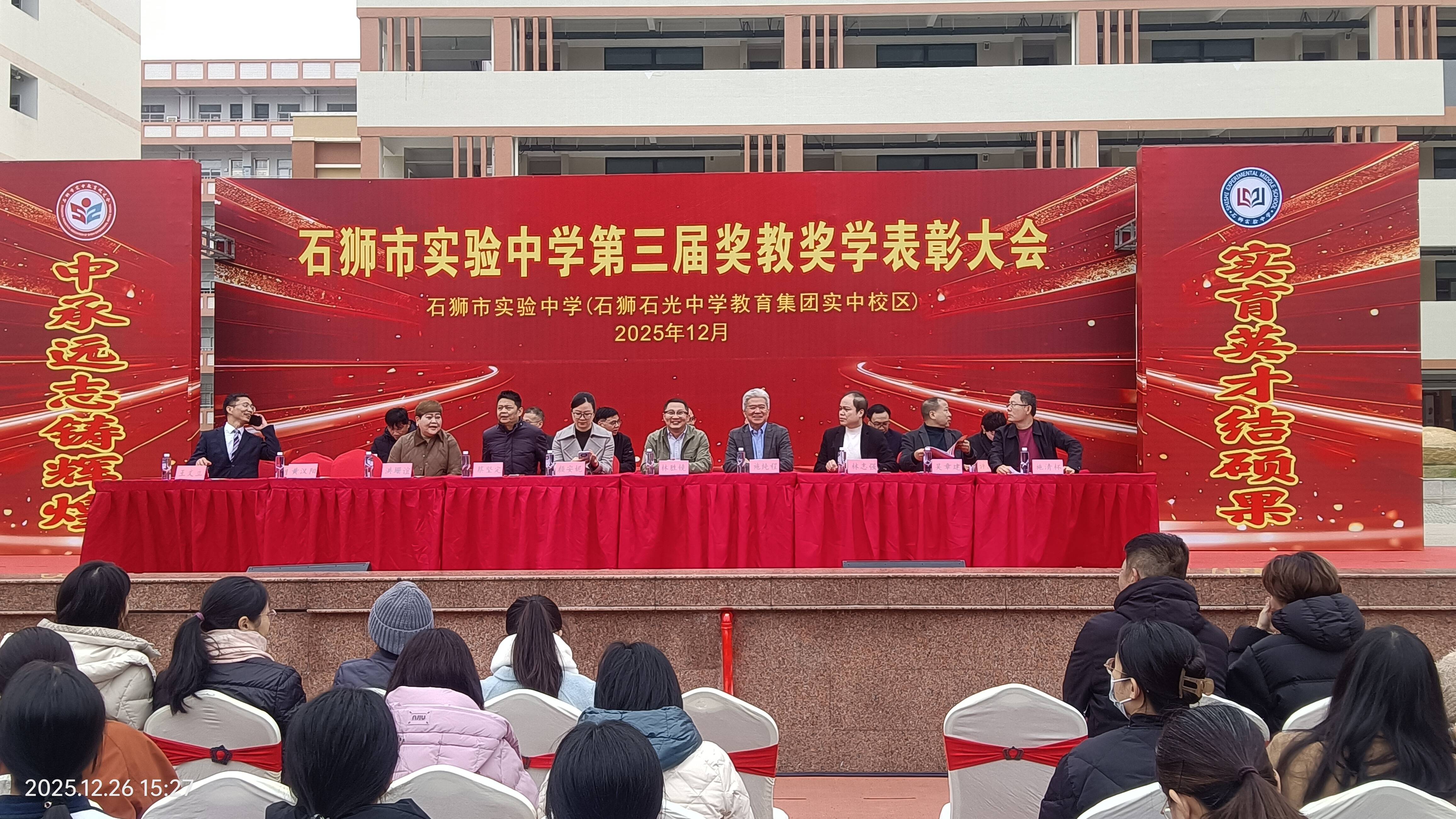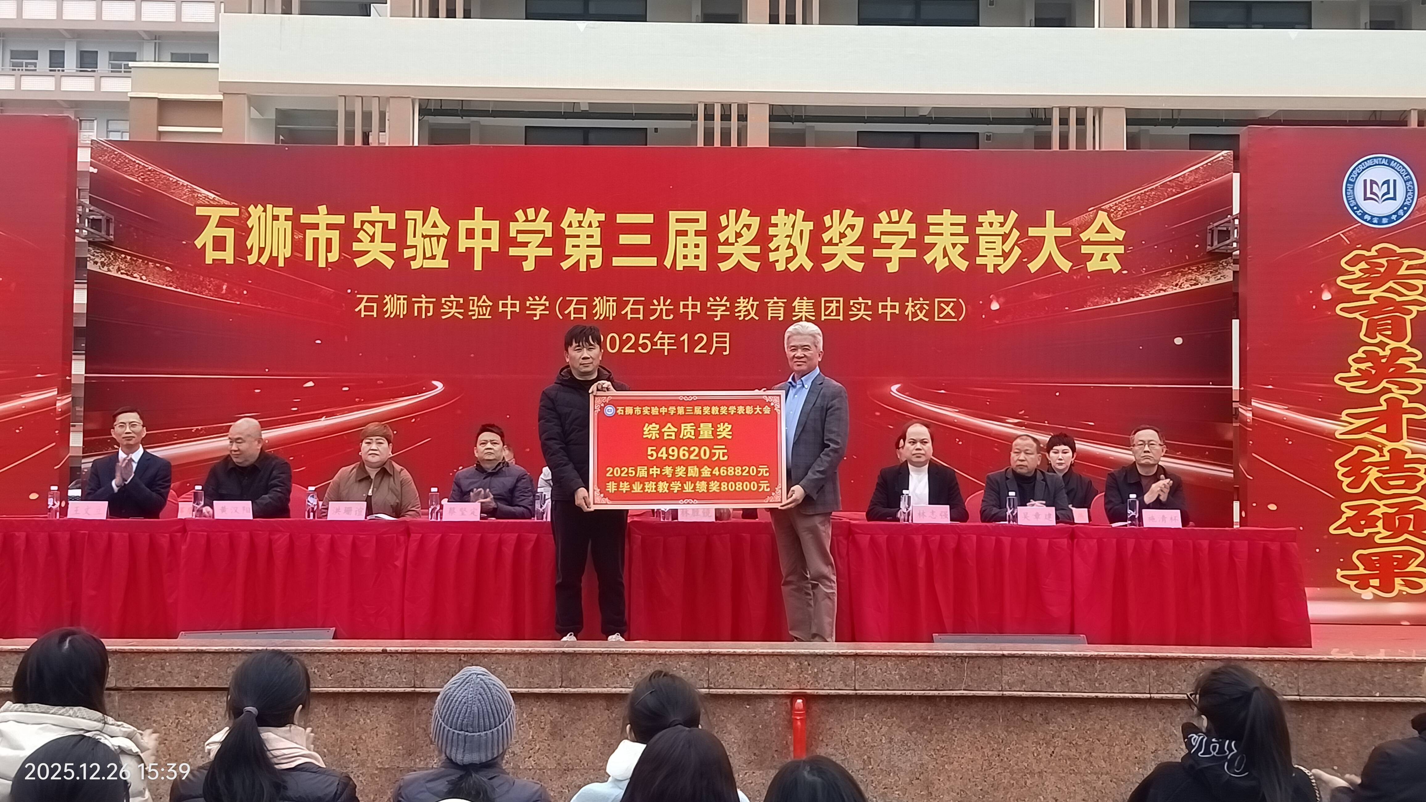 12月26日下午,石狮市实验中学(石狮石光中学教育集团实中校区)第三届奖教奖学表彰大会举行。旅菲侨亲、石光中学第二届教育基金会理事长、石狮市实中教育促进会名誉会长施纯程,旅菲侨亲、石光中学第五届校董会副董事长洪珊谊,市教育局、凤里街道、市实中教育促进会相关负责人,实验中学全体行政、教职员工、学生和家委代表等参加大会。