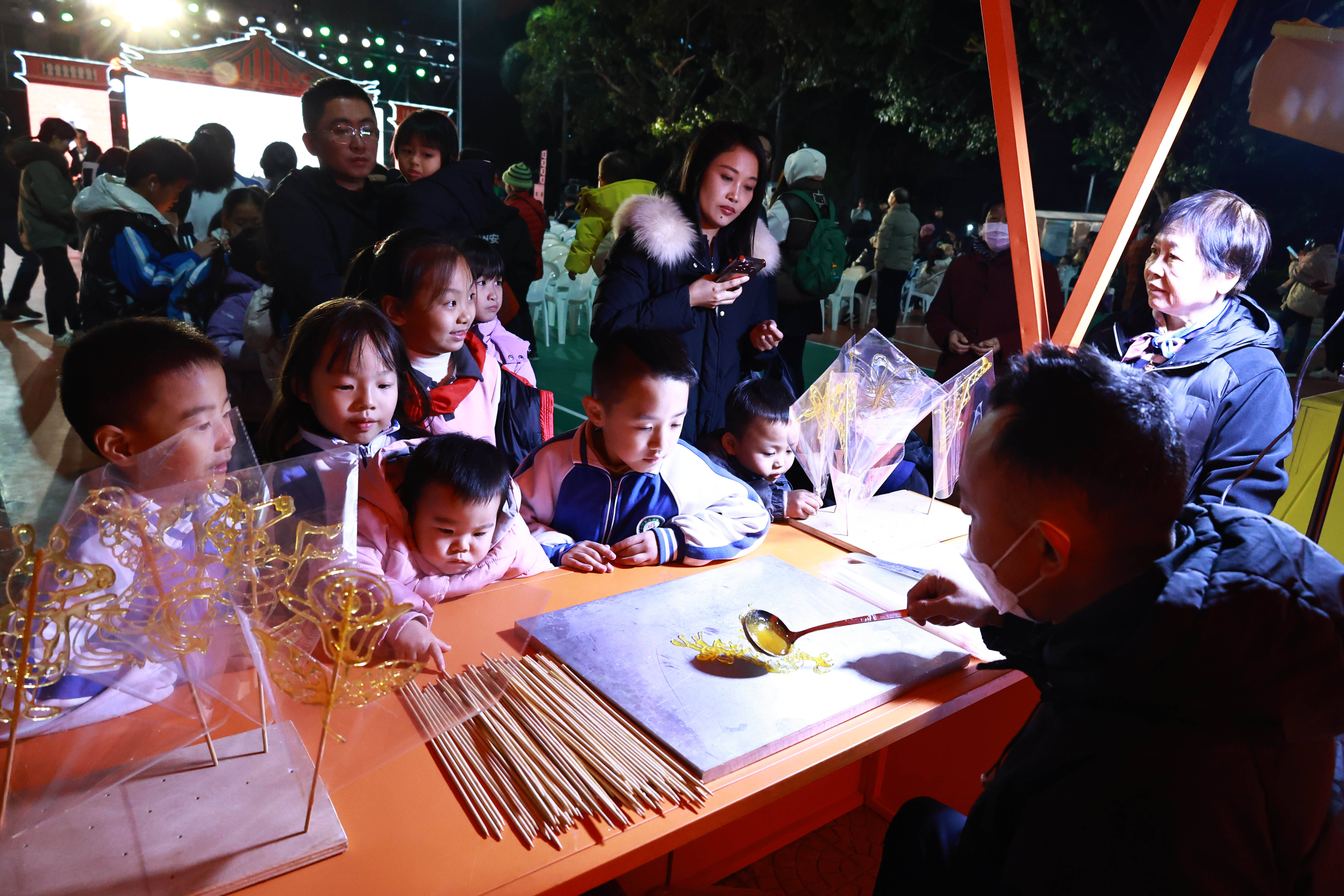 舞台侧方的配套活动同样热闹非凡,成为村晚的“人气打卡点”。非遗糖画艺人手持铁勺、舀起熔糖,所做龙、凤、生肖等造型栩栩如生,孩子们围在摊位前翘首期盼,感受传统技艺的魅力;拓印体验区里,市民群众亲手蘸取颜料、按压模板,一张张印有闽南特色图案的拓印作品新鲜出炉,在动手实践中体悟文化乐趣;伴手礼展示区陈列着海丝文化、闽南风情特色伴手礼,让大家直观感受本土产业的特色与活力;宝盖镇司法所的宣传展位前,工作人员通过发放资料、现场答疑等方式,向群众普及法律知识,将普法宣传融入文化活动,让文明法治理念深入人心。