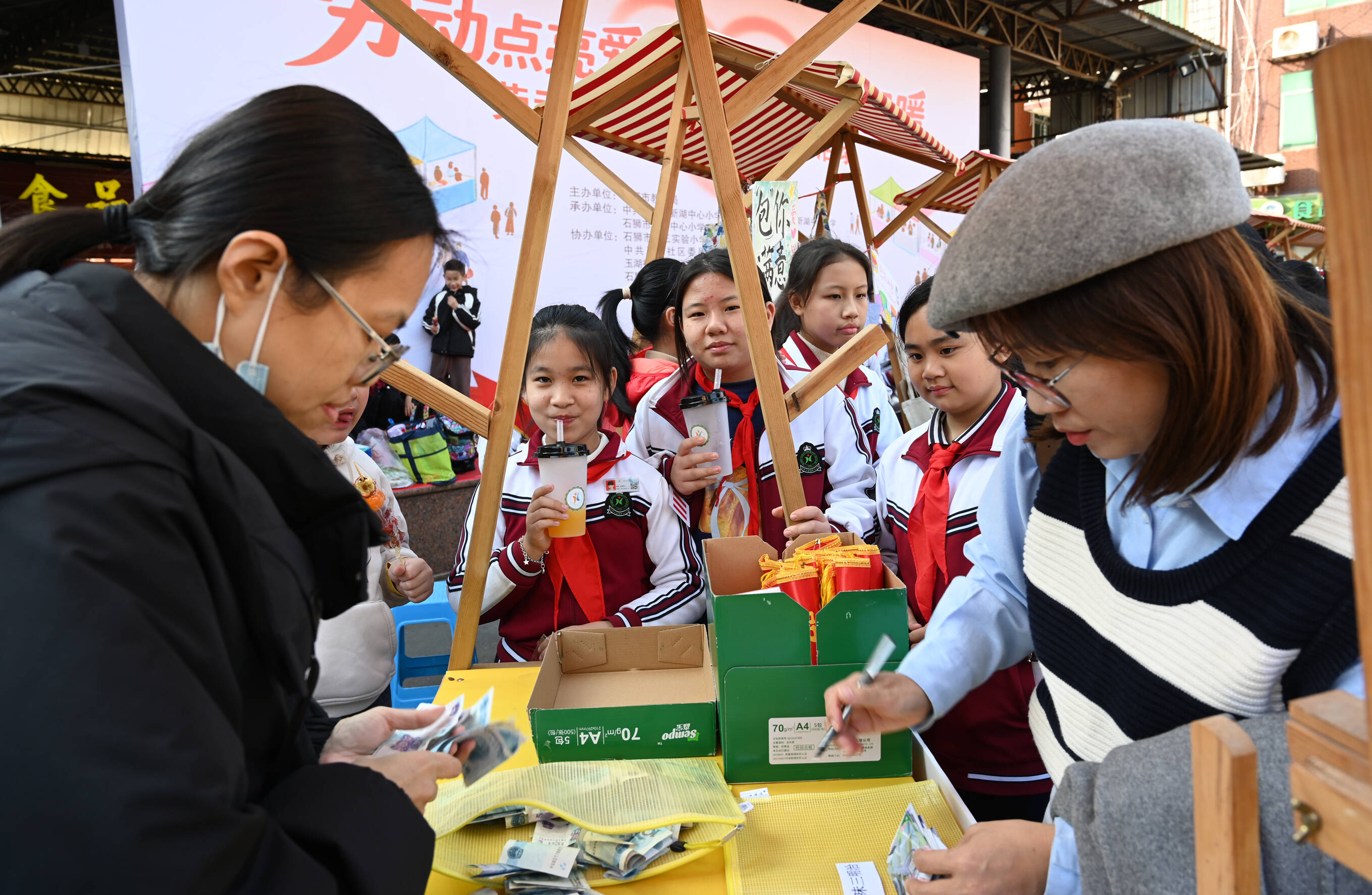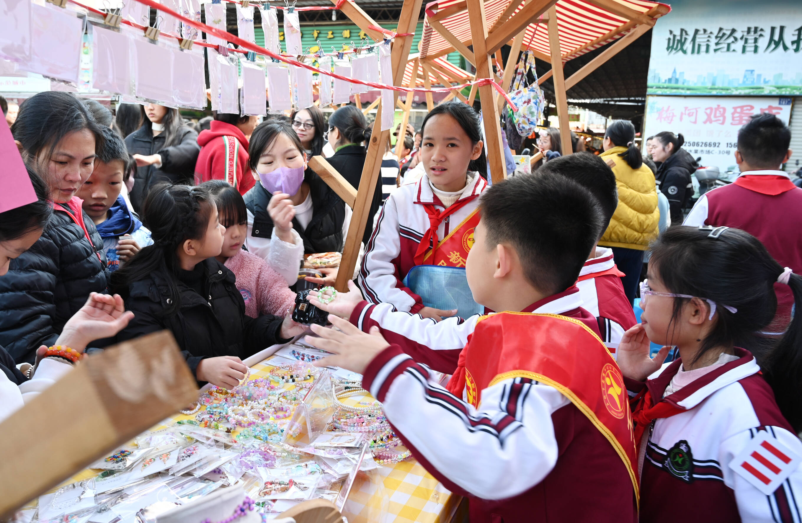 孩子们手持劳动卡、综合实践卡或现金,兴致勃勃地穿梭在各个摊位前挑选心仪的物品。食品摊位前香气四溢,“百变布丁”“冰糖葫芦”“水果西米露”等美味吸引了大批“顾客”;手工摊位前,孩子们精心制作的饰品、香囊和编织品更是让不少居民驻足称赞。