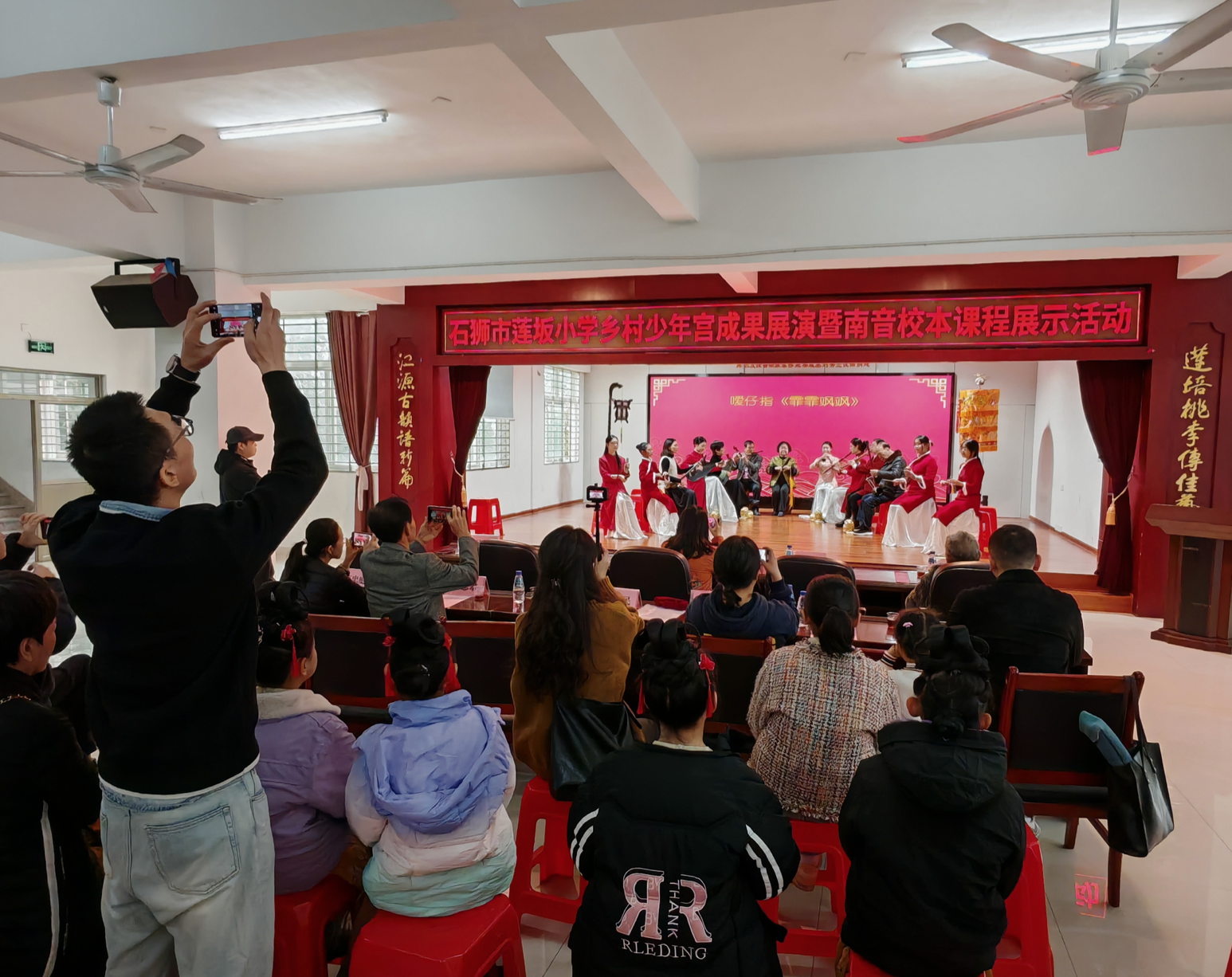 本次展演既是对该村自今年8月启动的南音进课堂培训成效的检验,也是石狮市文化特派员驻村工作的一次生动展示,让非遗在校园里绽放新光彩。展演还邀请了两位国家级非遗南音代表性项目传承人苏诗咏、夏永西到场,师生同台演出。作为我市文化特派员试点村,祥芝镇莲坂村自今年7月迎来文化特派员王培民、王燕玲进驻后,便立足本土南音文化底蕴,联合村关工委、万籁南音社推出暑期南音传承公益培训班,邀请南音非遗代表性传承人开展教学,让村里的孩子们近距离接触有着“中国音乐史上的活化石”之称的南音。