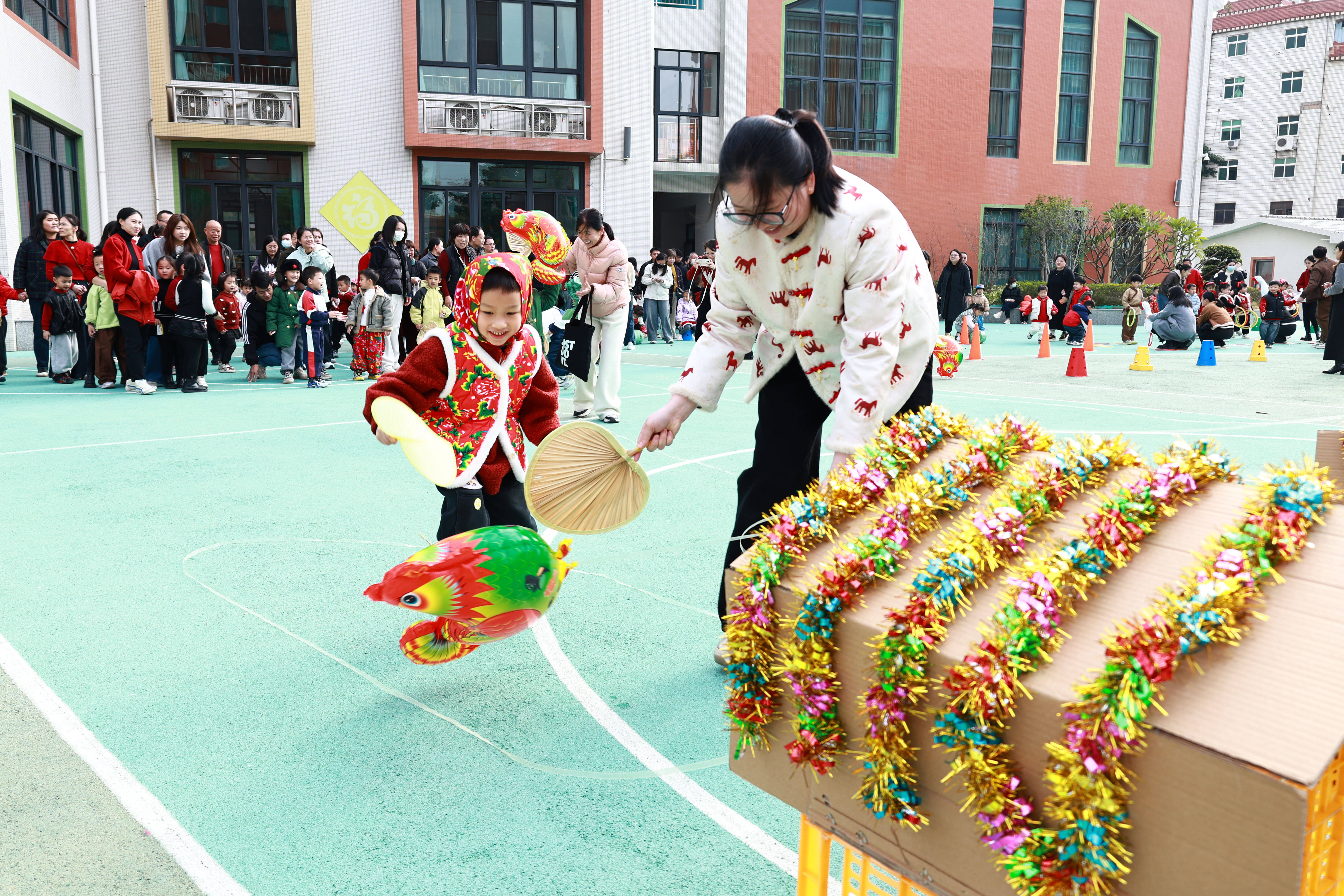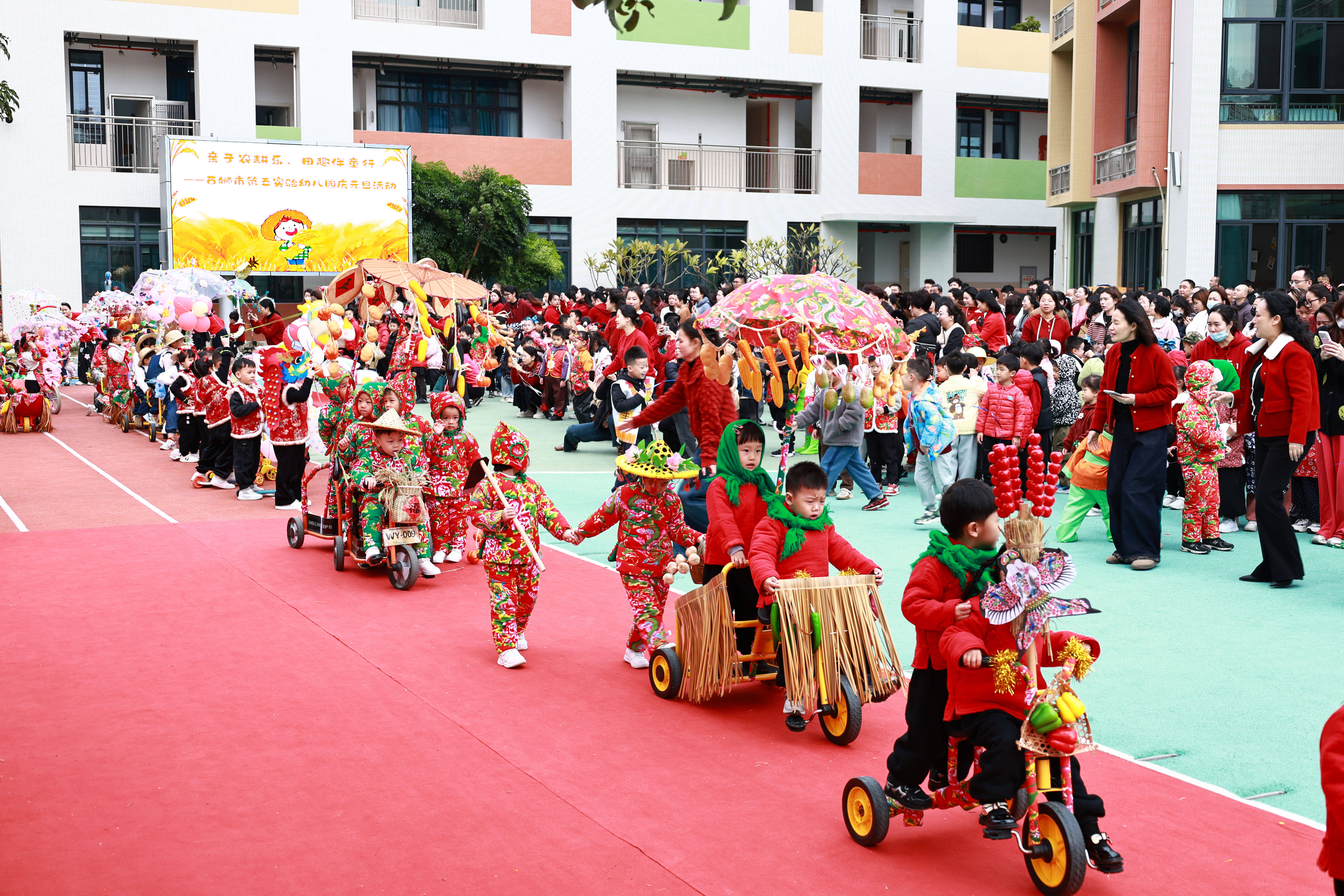 活动现场年味与乡土气息交融。门厅展示着孩子们充满田园想象的绘画作品,各游戏区精心布置,洋溢着节日氛围。活动在啦啦操热舞中拉开序幕。随后,45辆花车巡游精彩上演,萌趣造型引得掌声不断。