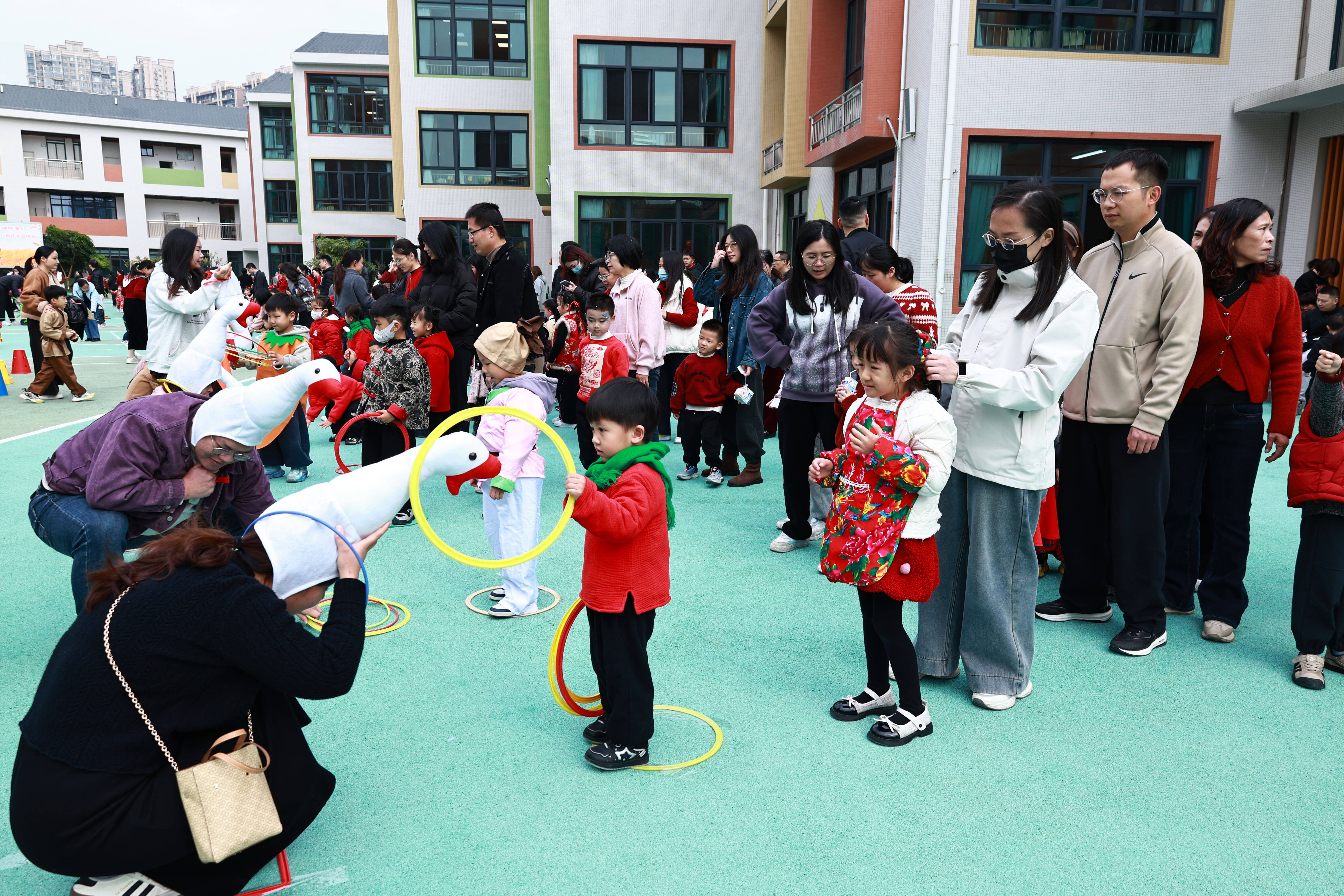 亲子游戏环节高潮迭起,“蔬菜套圈”“母鸡下蛋”“摸石过河运粮食”“种豆得豆”等十余项农耕主题游戏轮番登场。家长与孩子默契配合,在欢笑中认识农作物、体验劳作乐趣,重温童年时光。现场加油声、欢呼声此起彼伏。
