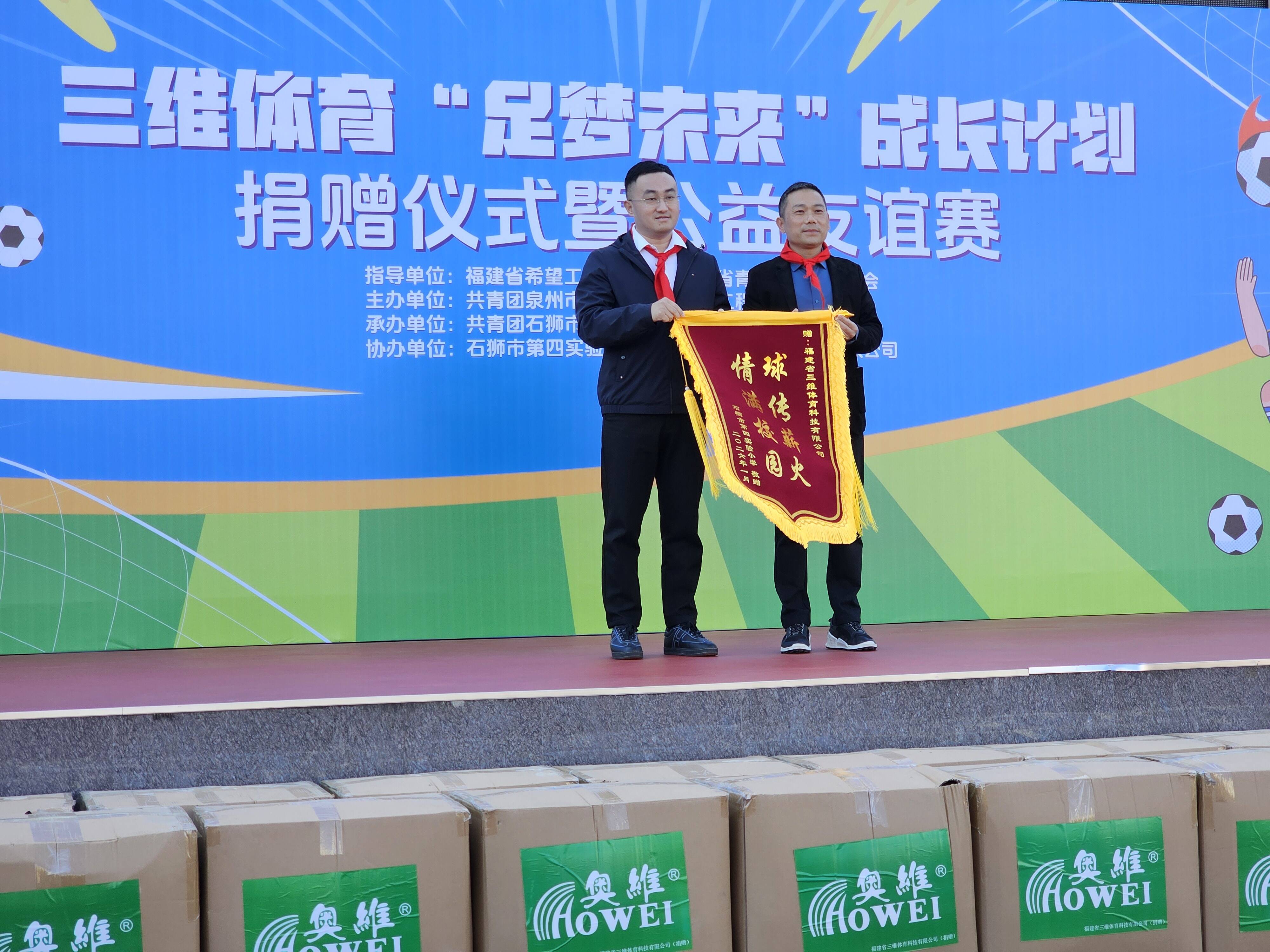 1月19日下午,“足梦未来”成长计划捐赠仪式暨校园足球友谊赛在石狮市第四实验小学举行。活动中,福建省三维体育科技有限公司向石狮市第四实验小学、永宁中学、石狮市实验小学(蚶江校区)、蚶江镇洪窟小学等泉州地区20余所足球特色校捐赠了价值五十万元的校园足球物资。