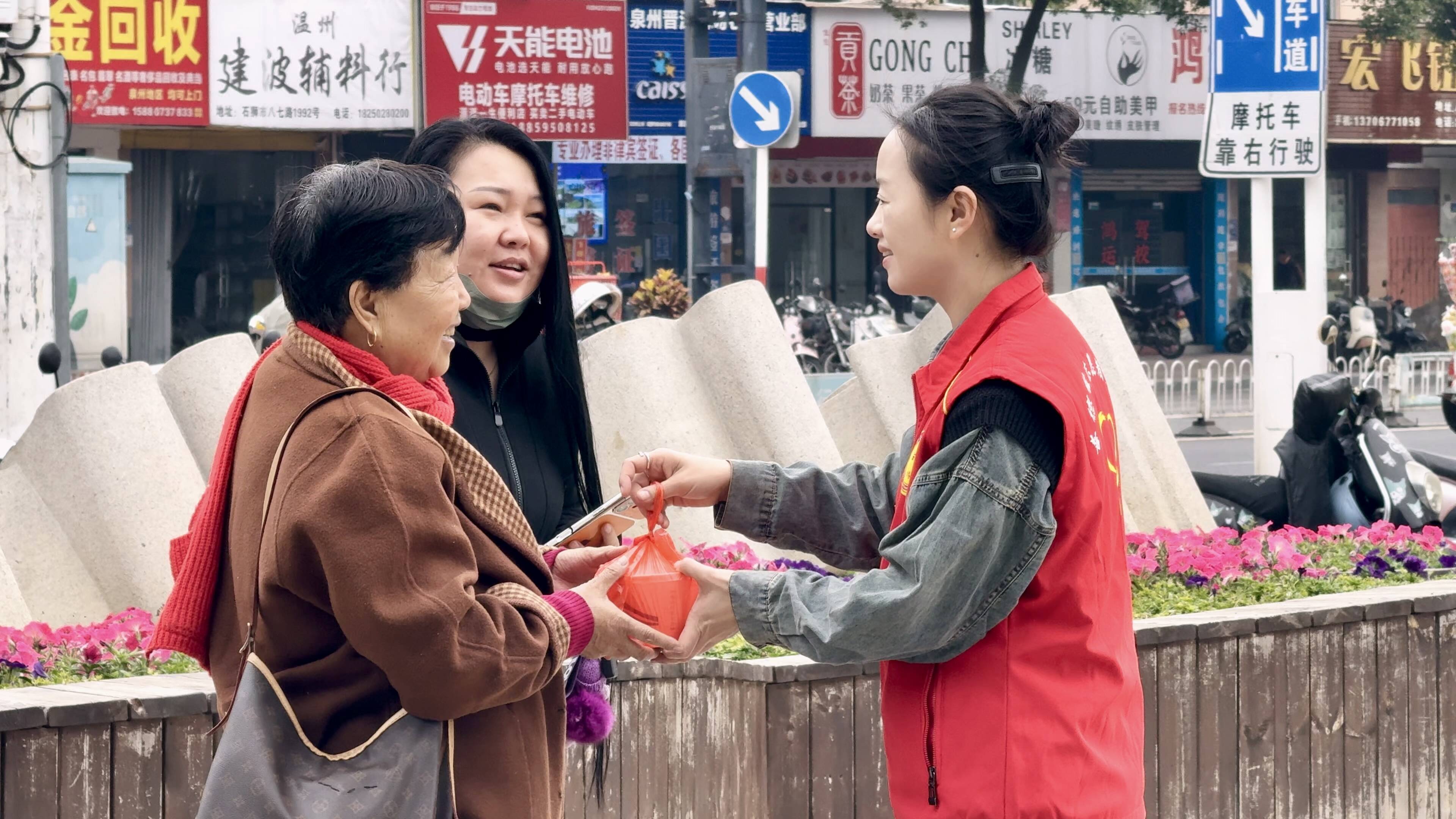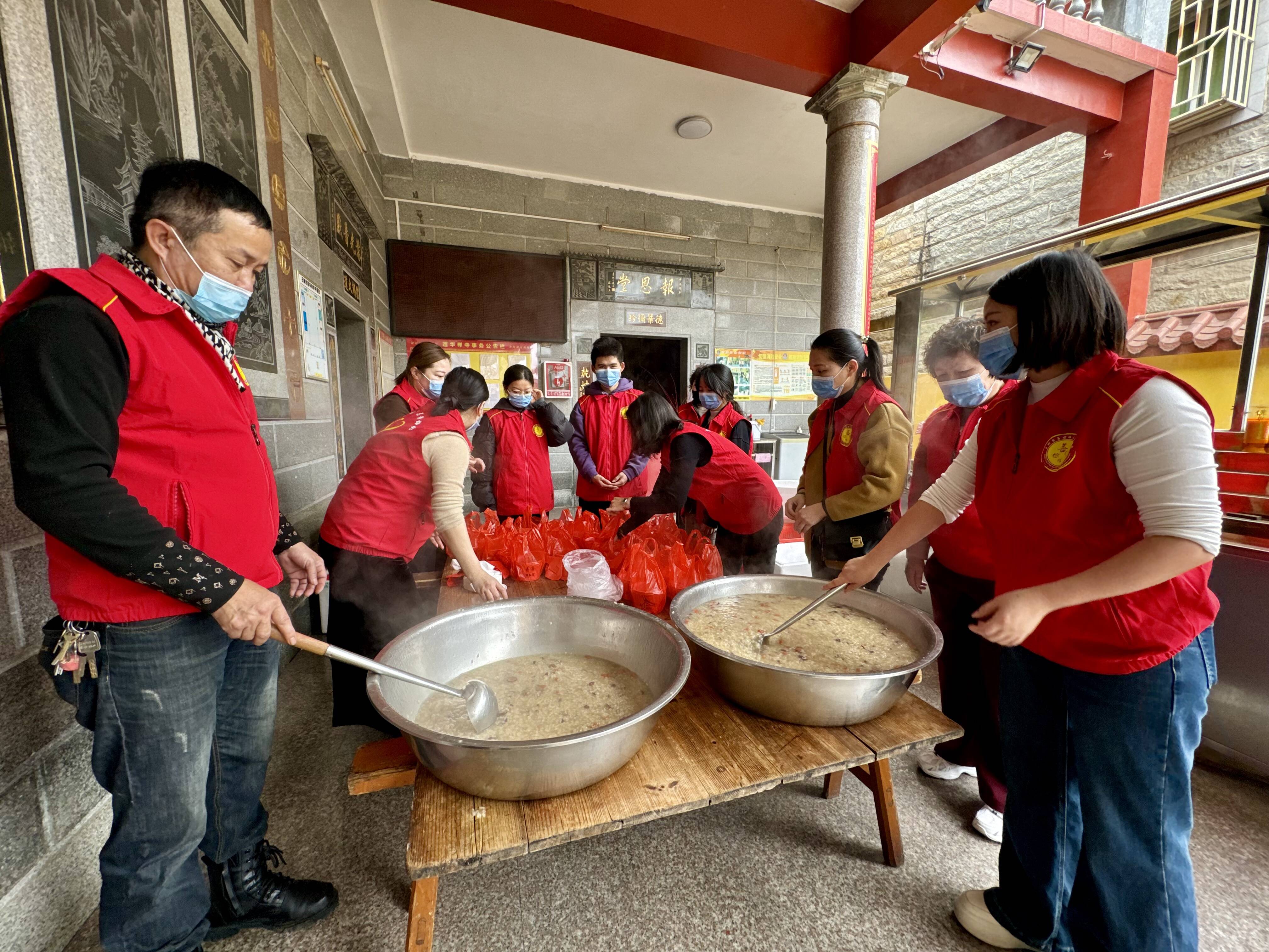 当天,石狮市政协委员灵秀活动组、灵秀镇新时代文明实践所等联合开展“粥香传情 益路相伴”送腊八粥志愿服务活动。在活动现场,志愿者和义工将由糯米、红豆、莲子等食材熬制的腊八粥一碗碗打包分装好后,前往金汇六角亭、容卿菜市场、鸳鸯池公园等人流密集场所,免费送给过往市民及户外工作者。当日,工作人员累计送出800份热粥。除了送上“舌尖上的年味”,志愿者还为环卫工送去春联,提前送上新春祝福,让冬日的城市街头充满暖意。