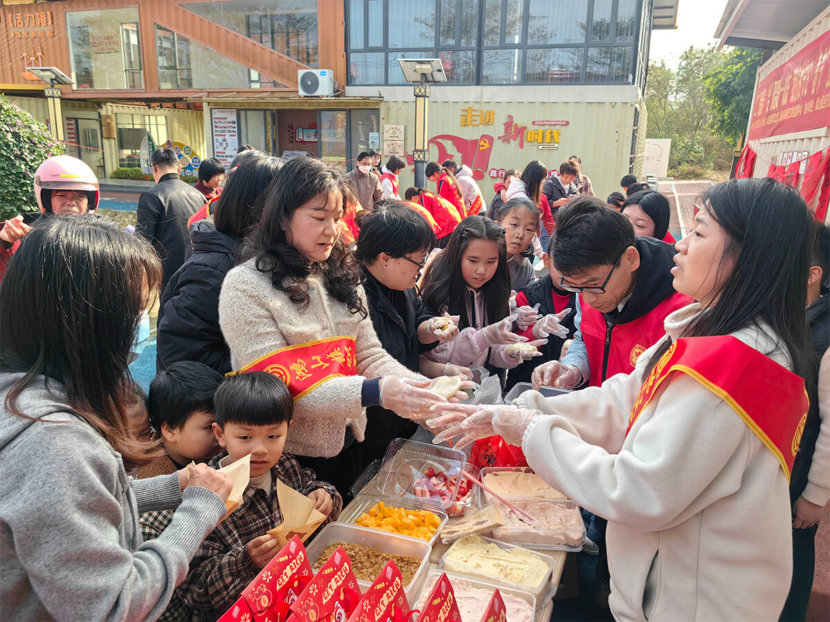 活动现场分为三大特色区域。“工”贺新春传统文化体验区,鸿山镇福民中心小学的师生们及志愿者现场挥毫,一副副寓意吉祥的春联与饱满圆润的“福”字在笔尖诞生;“巧手纳福”拓印体验区,孩子们与家长一同动手,亲手拓印出属于自己的“福”字作品;“甜蜜滋味”麻糍制作区,志愿者们现场制作传统麻糍,揉搓塑形后,将成品分发给职工群众。