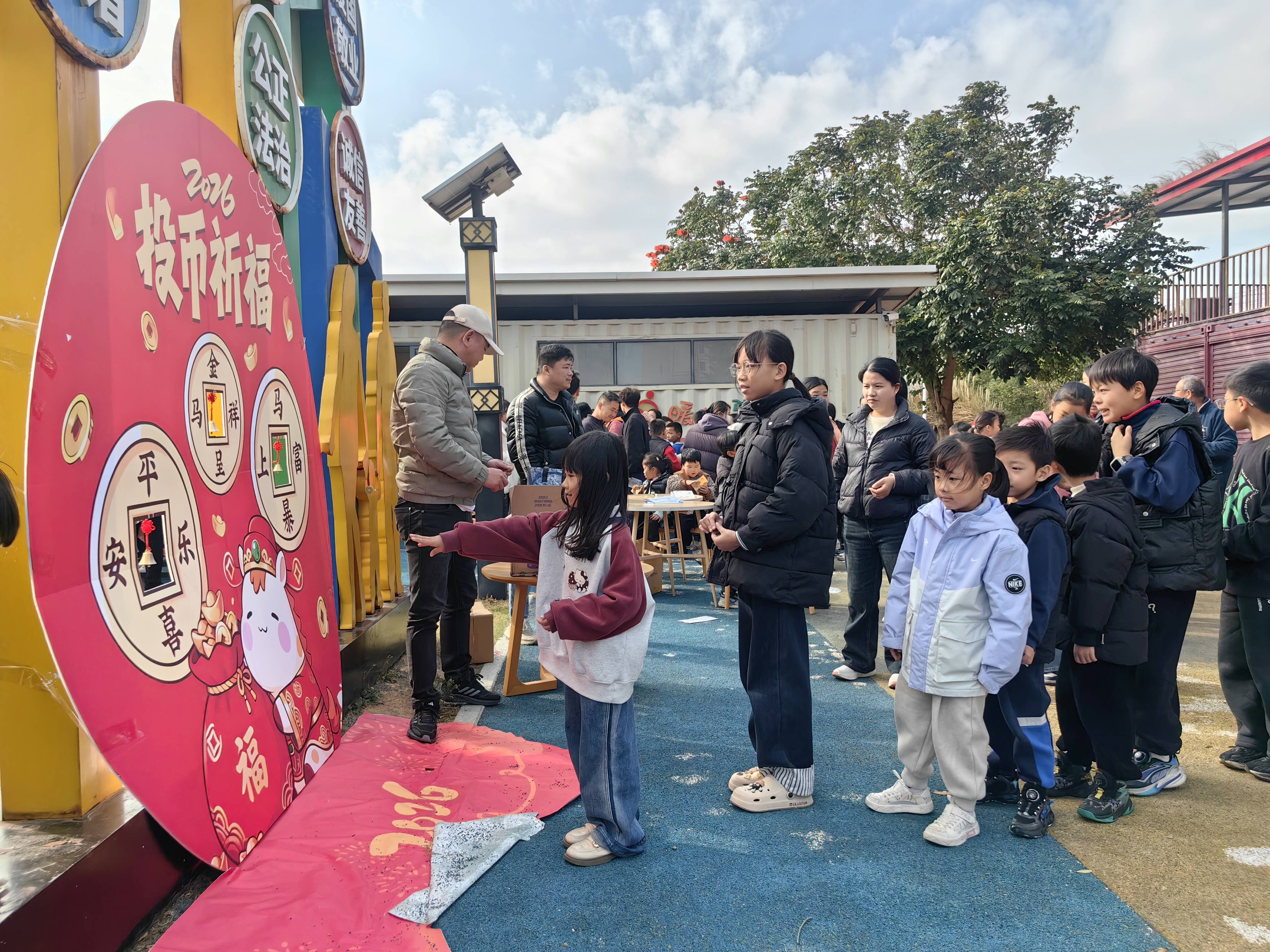 乐享新春趣味游园互动区,“投币祈福”游戏中,大家专注地将祈福币投向铃铛。参与者也在收获小奖品的同时,感受新年将至的喜悦与期待。