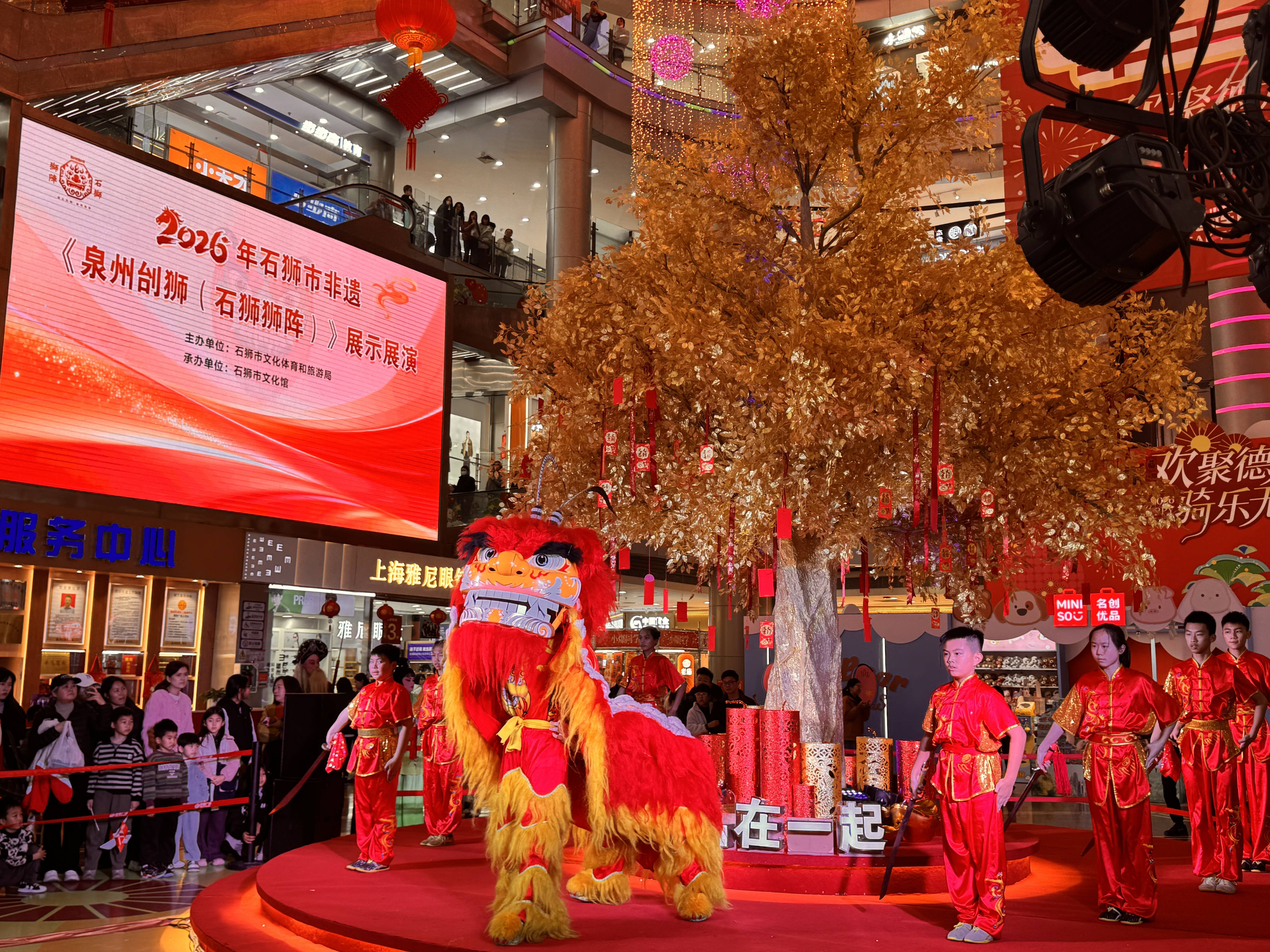 2月6日晚,市区德辉广场内锣鼓喧天、喜气洋洋,2026石狮市非遗《泉州刣狮(石狮狮阵)》展示展演在此拉开帷幕,以石狮狮阵为代表的国家级非遗“泉州刣狮”在商场中庭舞台精彩上演,为市民提前送上浓郁年味。