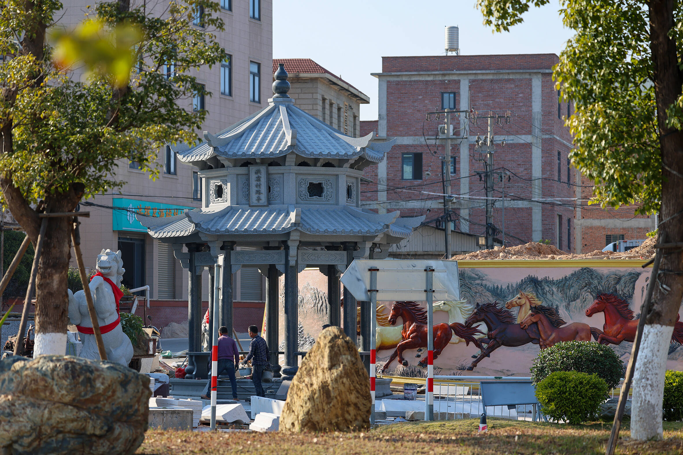 据悉,这座由洪窟村海内外乡贤捐资200余万元建设的文化景观工程,涵盖村口牌坊、骏马群围墙、马雕像、石狮子、景观亭等核心构件。巍峨石牌坊飞檐斗拱,镌刻着“洪窟”二字的匾额在春日暖阳下熠熠生辉;牌坊两侧,一对石狮雄踞相望,鬃毛流转、神态威严。最引人注目的当属沿围墙奔腾的骏马群雕——八匹花岗岩骏马或昂首嘶鸣,或扬蹄疾驰,与独立设置的石头马雕像相映成趣,而六角景观亭飞檐翘角,在车流穿行的交汇处勾勒出“万马奔腾迎新岁”的动感画卷。