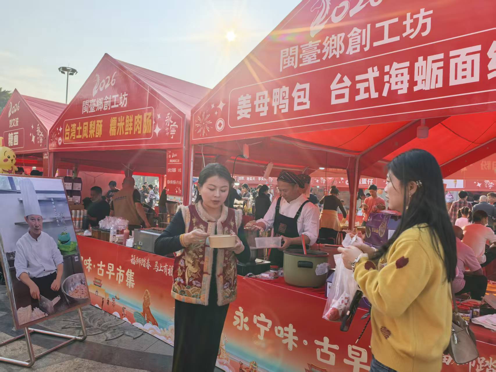 2月22日,“永宁味”古早市集在永宁古卫城开市的第四天,来自闽台乡创工坊的台湾特色美食惊艳亮相,台湾厨师徐顺伟、张顺棠、林秀姿,用地道台式风味与闽台融合料理,为永宁古镇新春增添别样舌尖滋味,书写两岸饮食文化交融的暖心篇章。