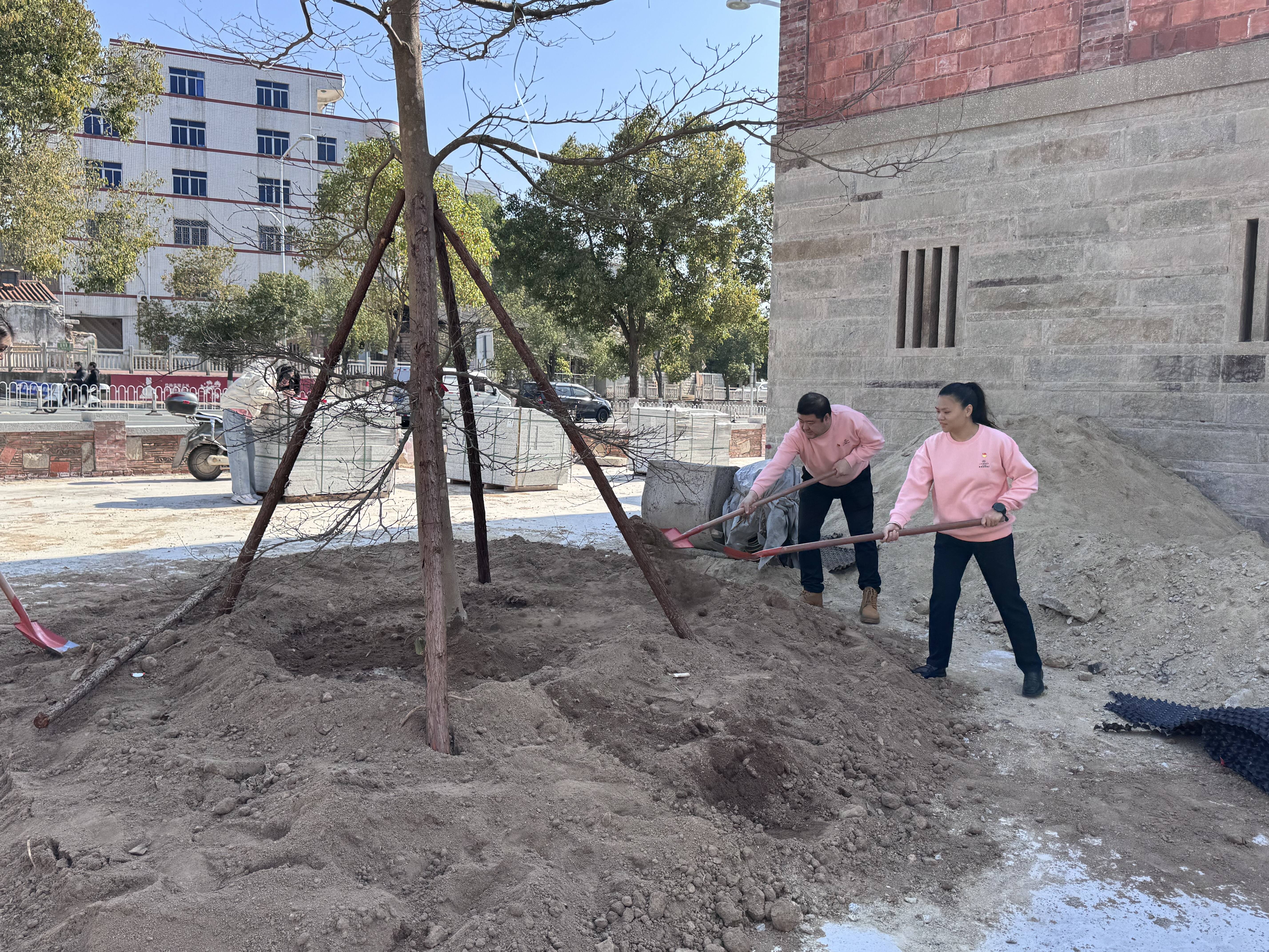 活动现场,大家热情高涨、分工协作,挥锹铲土、扶苗定植、培土围堰、提水浇灌,各个环节衔接有序、配合默契。此次活动栽下鸡蛋花树、三角梅等多种绿植,新栽苗木整齐排列、生机盎然,为八卦街周边增添了亮丽的生态风景。
