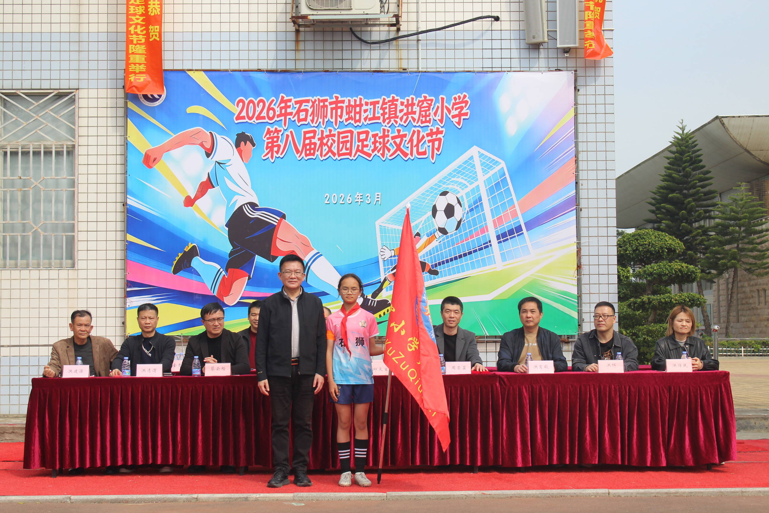 阳光体育,快乐足球。3月20日下午,2026年洪窟小学第八届校园足球文化节开幕。石狮市教育局、洪窟村、洪窟小学校董会和学校有关负责人及家委会代表共同为本届校园足球文化节开球。