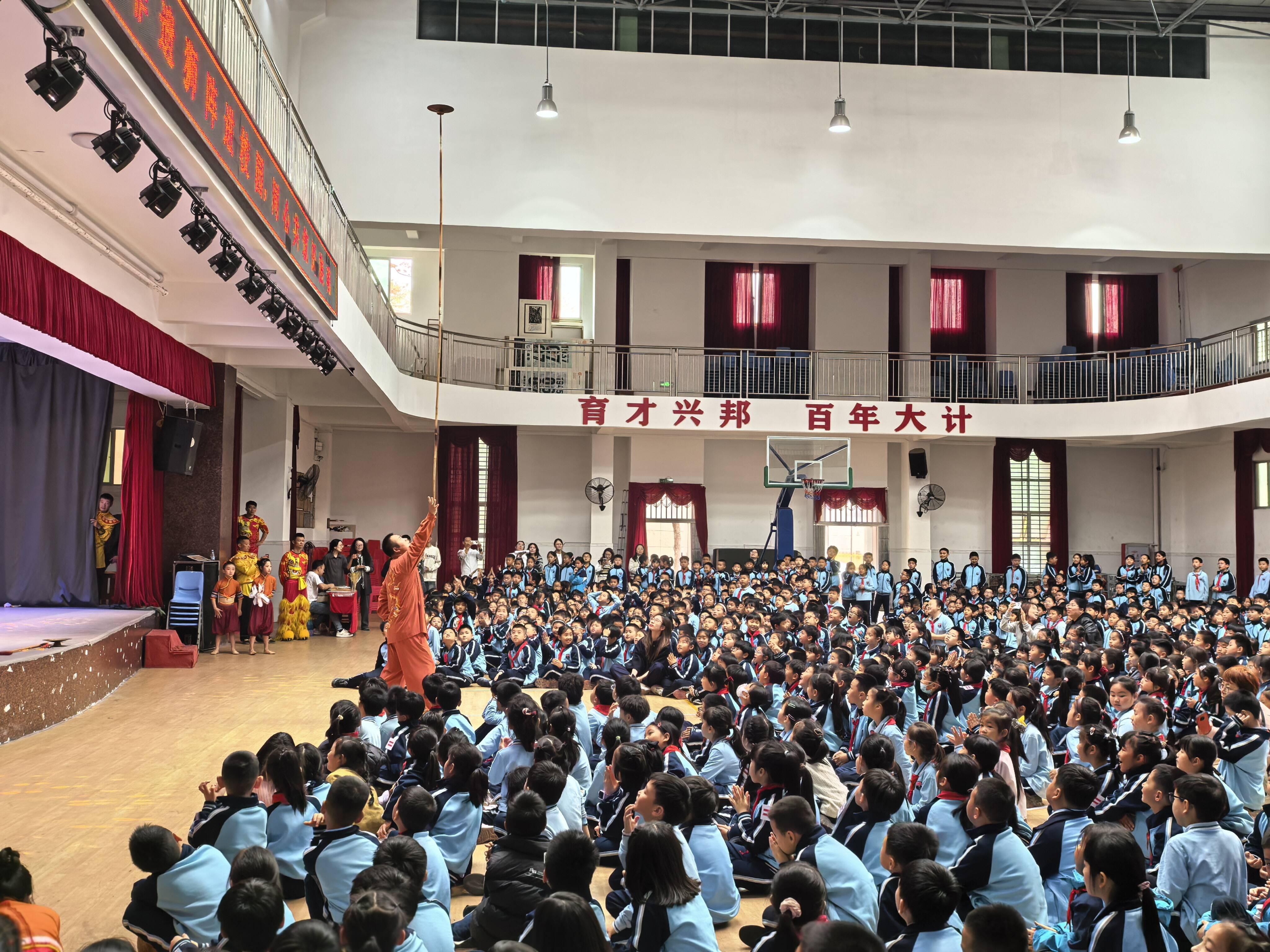 舞台上,包括提线木偶、石狮狮阵、掷铙钹、糖画等一批独具闽南特色的非遗展演精彩绝伦;舞台下,数百名学生围坐成整齐方阵、目光专注,掌声、欢呼声此起彼伏。孩子们时而为醒狮的灵动姿态惊叹,时而为武术绝技鼓掌,不少学生主动记录精彩瞬间,眼中满是好奇与喜爱,感受着闽南非遗的独特魅力。