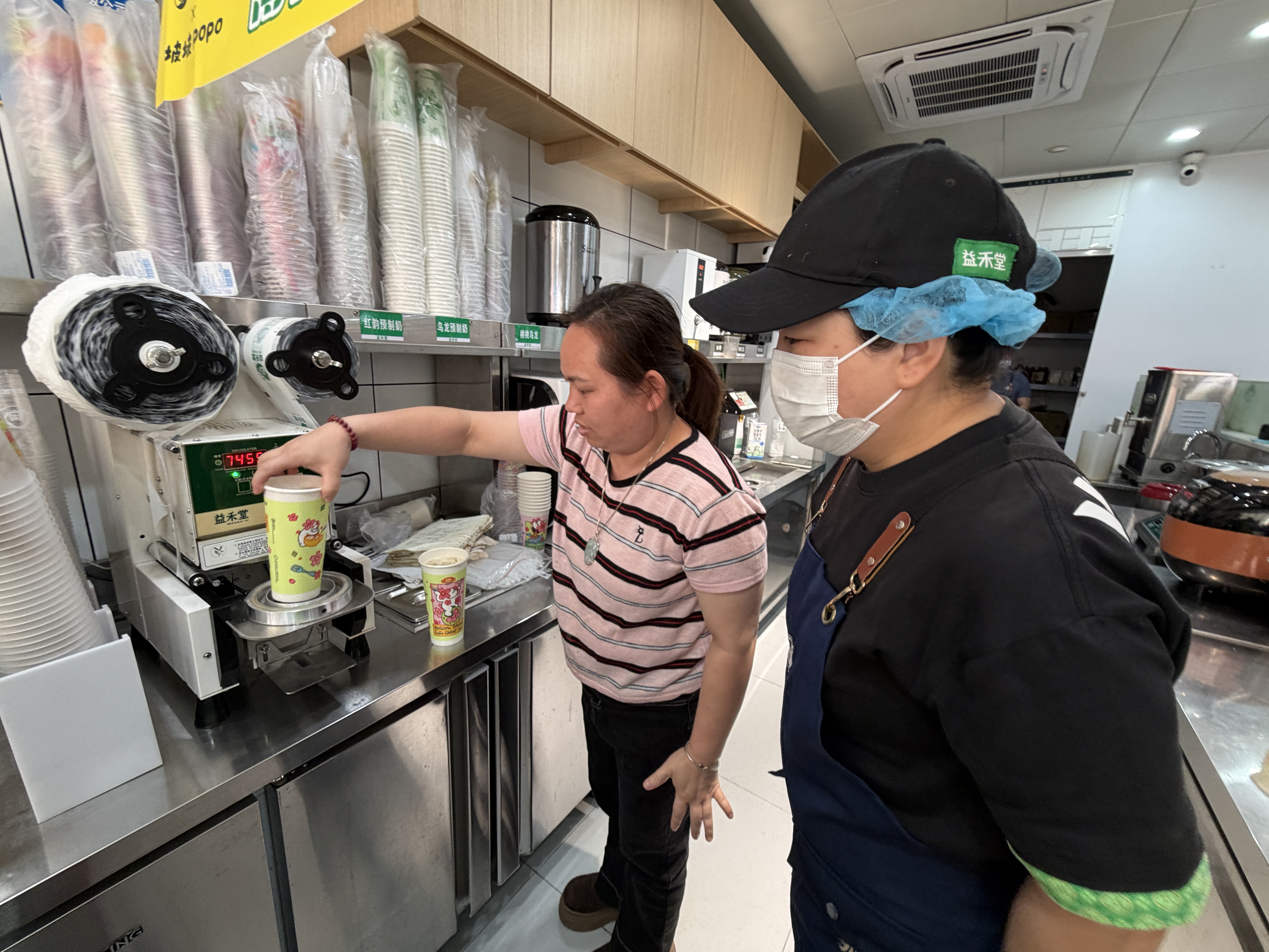 活动过程中,专业工作人员化身授课导师,围绕奶茶制作机器操作规范、拉茶核心技巧、珍珠熬制流程等内容,逐一细致讲解,手把手搭建系统的奶茶制作知识框架,让渔嫂们快速掌握。实操演练中,导师先进行全程示范,再指导渔嫂们动手实操,耐心解答操作难题、纠正不规范动作。