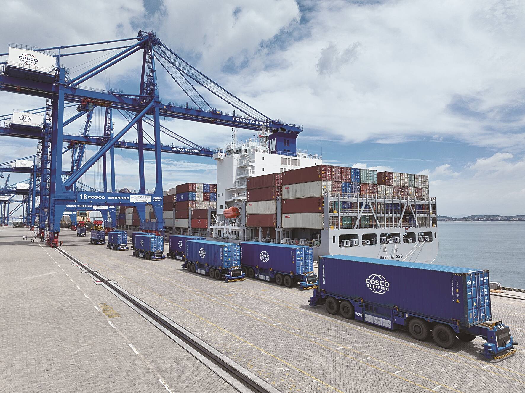 石湖港区无人驾驶的集装箱卡车正高效运输货物