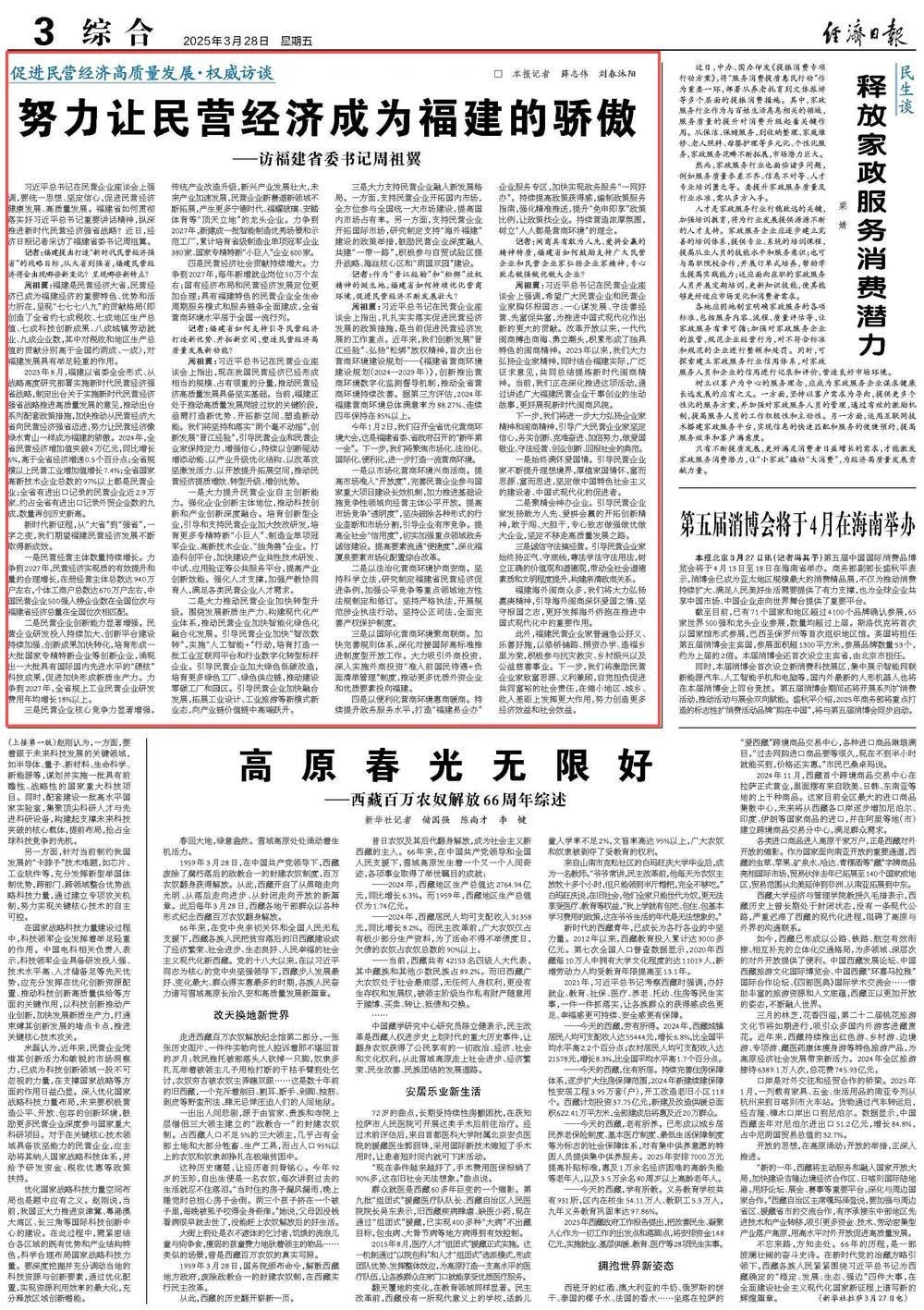 历经多年发展,民营经济已成为福建经济的重要特色、优势和活力所在,创造了全省约七成税收、七成地区生产总值、七成科技创新成果、八成城镇劳动就业、九成企业数量,具有举足轻重的作用。新时代新征程,作为民营经济大省,福建如何促进民营经济健康发展、高质量发展?日前,福建省委书记周祖翼接受人民日报记者采访,相关稿件于3月28日人民日报刊登,题为《加快建设新时代民营经济强省》。详情>>>