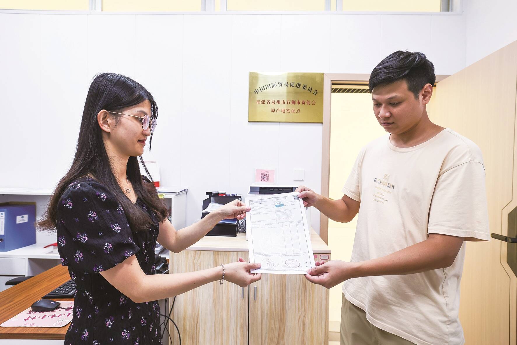 原产地证书,作为商品进入国际贸易领域的“经济护照”、享受进口国优惠关税待遇的“纸黄金”,是石狮外贸前行的重要助力。记者10月13日获悉,去年10月份以来,石狮市贸促会交出一份亮眼的外贸服务成绩单,累计为祐瑞纺织、信慈进出口贸易、聪祥新材料科技、旺晟贸易等120家企业办理1351份一般原产地证书,涉及签证金额6773.6万美元,为我市企业国际化经营提供支持,助推石狮制造走进共建“一带一路”国家和地区,助力石狮企业“走出去”。