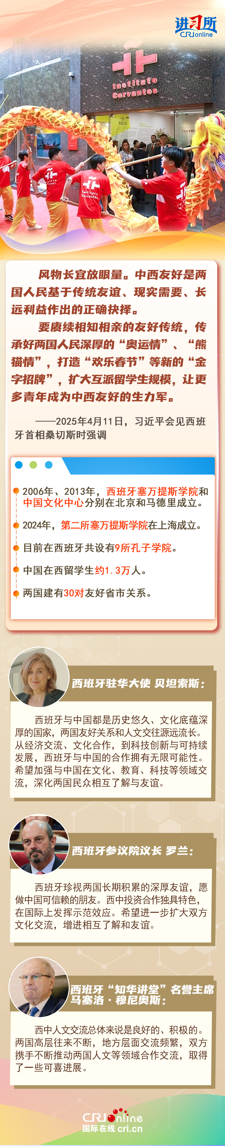 今年是中西全面战略伙伴关系建立20周年,也是中欧建交50周年。多年来,中西两国领导人保持密切互动,秉持互尊互信、互利共赢精神,两国在深化贸易、投资、科技创新、绿色能源等领域取得丰富合作成果,双边关系走在中国同欧洲国家关系前列。在西班牙人士眼中,良好的对华关系对西班牙、欧洲和世界具有重要意义,将会为两国人民带来更多实实在在的福祉,也将共同创造更美好的未来。