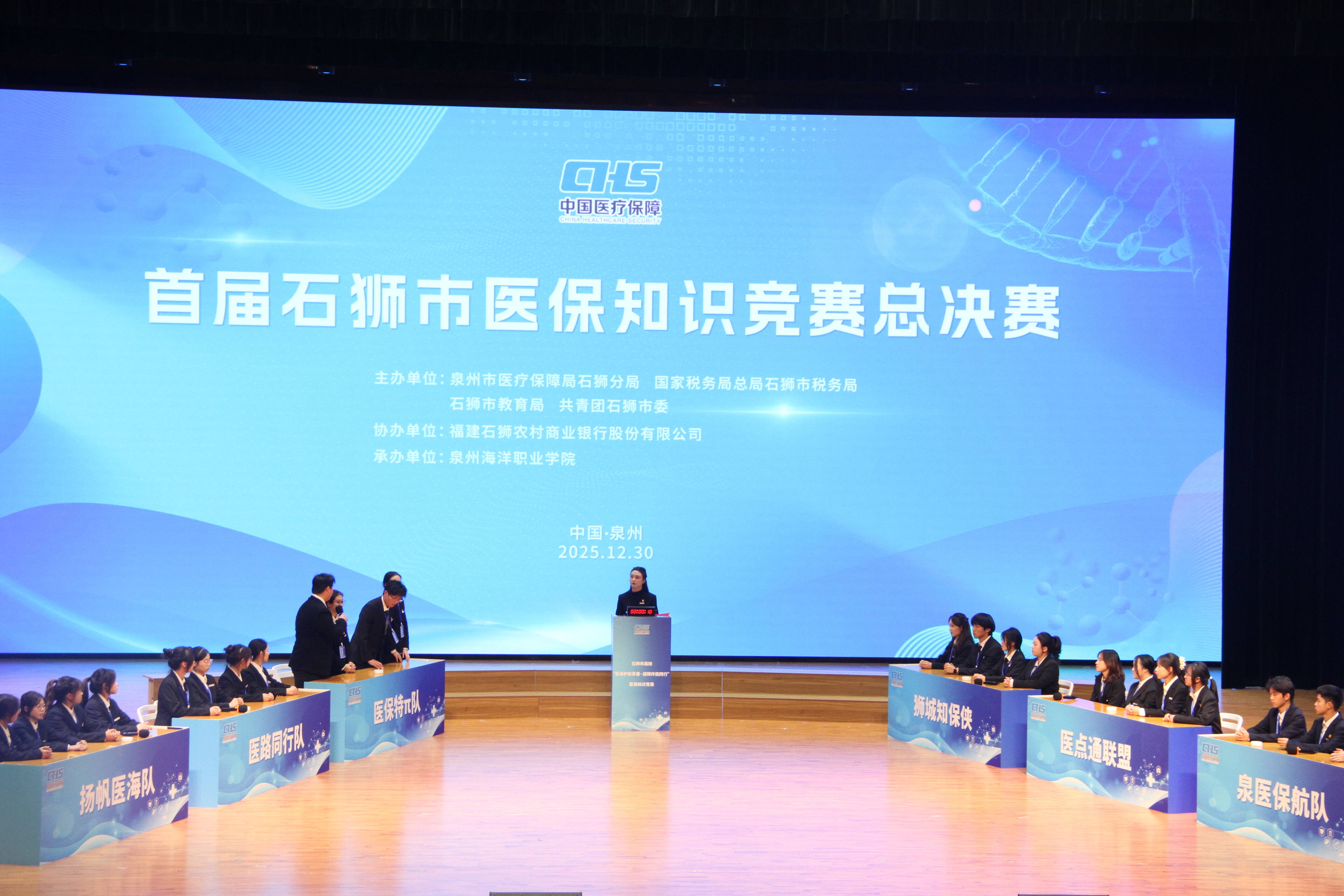 2025年12月30日下午,石狮市高校“医保护航青春·保障伴我同行”医保知识竞赛总决赛在泉州海洋职业学院国际学术交流中心举行。石狮市政府副市长黄明瑄,泉州市医保局四级调研员杨其祥,石狮医保分局、市税务局、市教育局、团市委及在石三所高校主要负责人等参加活动。