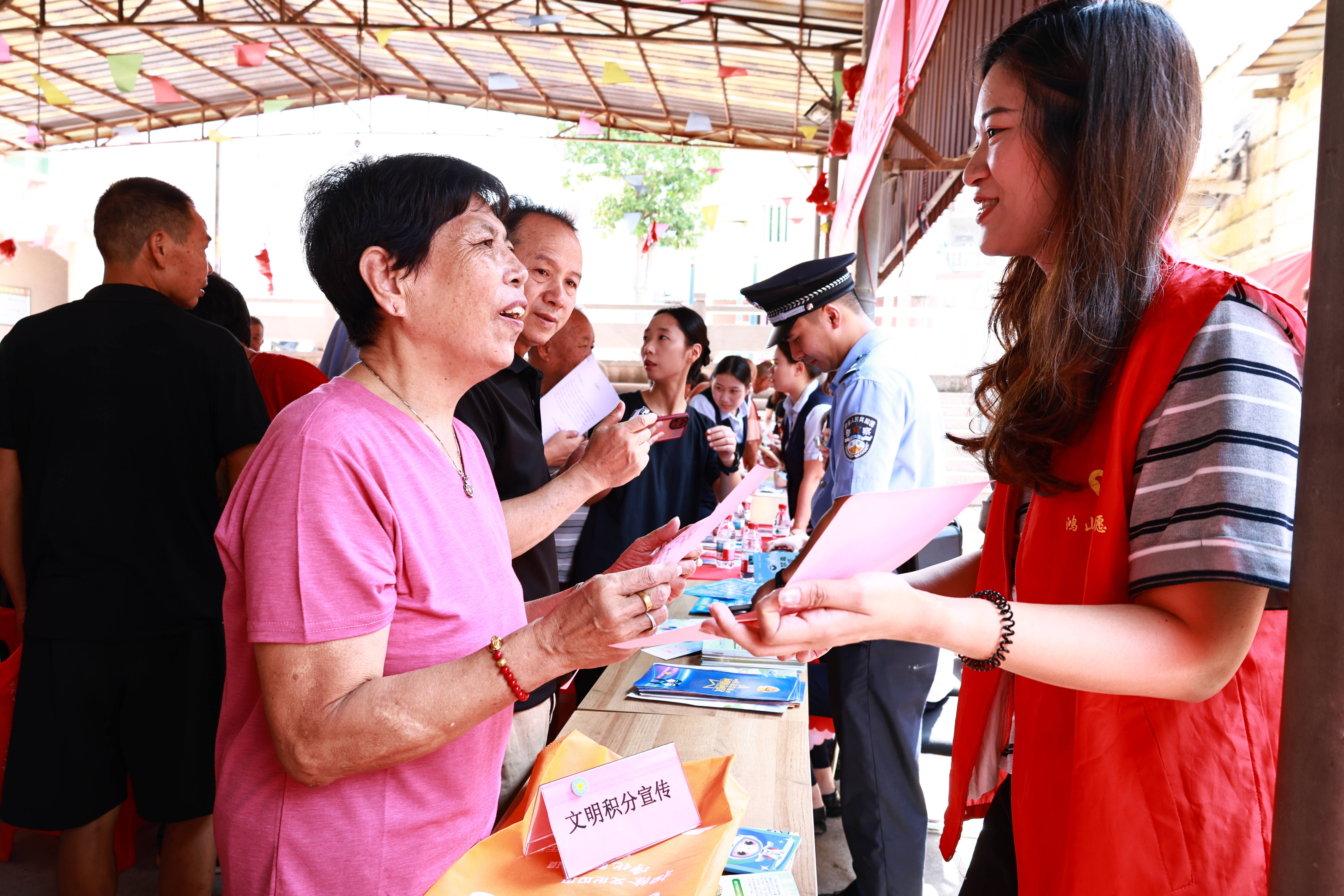 活动现场,工作人员通过讲解和发放宣传折页,向群众普及网络安全、文明积分、垃圾分类等知识;来自闽南理工学院、泉州海洋职业学院的大学生志愿者带来青春洋溢的歌舞和诗歌朗诵节目,为大家送上节日祝福。