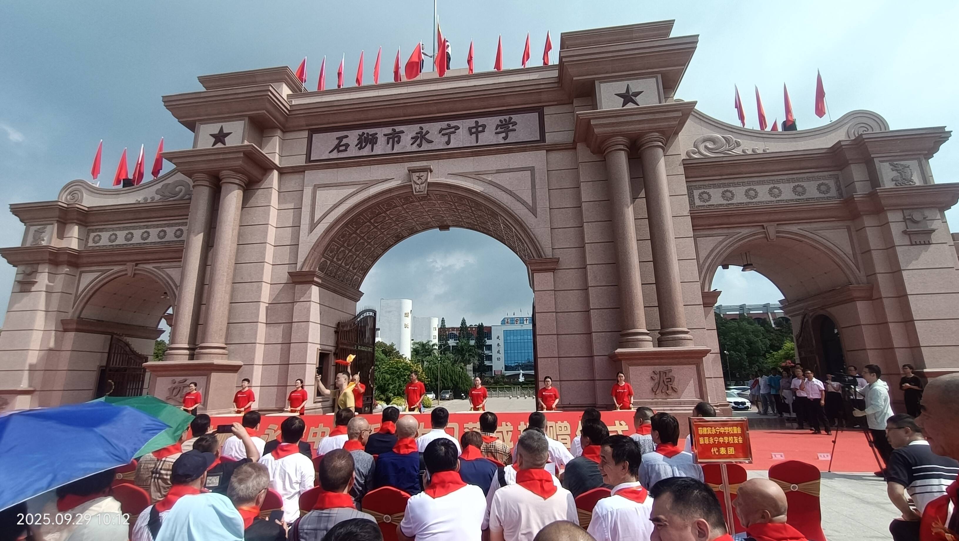 9月29日上午,石狮市永宁中学新校大门落成捐赠仪式举行。永宁中学香港校友卢温胜、佘英杰、佘祖忆、龚清海、卢清松等,永宁中学菲律宾校董校友蔡文默、陈建煌、蔡文生、李天欣、陈贤平等,永宁镇党委、政府领导,石狮市永中教育促进会负责人,各地校友会代表,永宁中学师生代表等参加仪式。