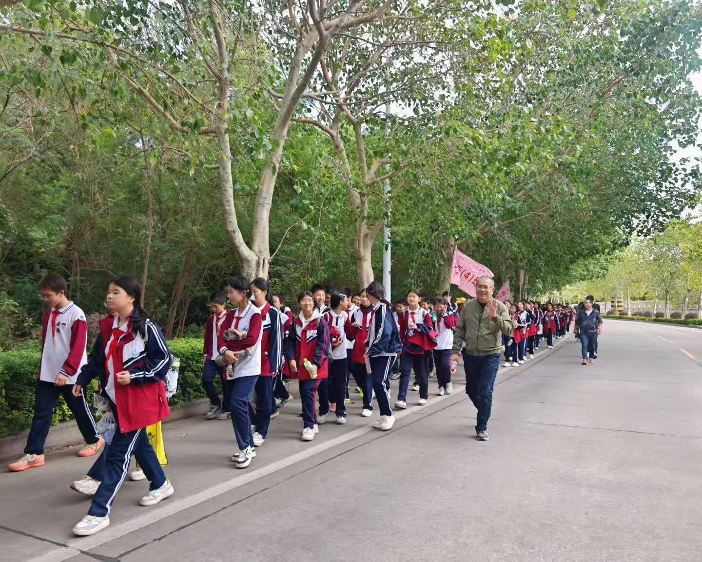 下午1时,授旗仪式结束后,身着统一服装的队伍从学校有序出发,沿着既定路线环绕宝盖山徒步前行。全程16公里的路程中,师生们相互鼓励、并肩前行,用坚持诠释顽强拼搏的精神。历经约4小时,全体师生顺利完成行程,活动圆满落幕。此次活动将体能锻炼与红色教育深度融合,不仅磨砺了师生的意志,更让大家在行走中感悟历史重量,厚植爱国主义情怀。