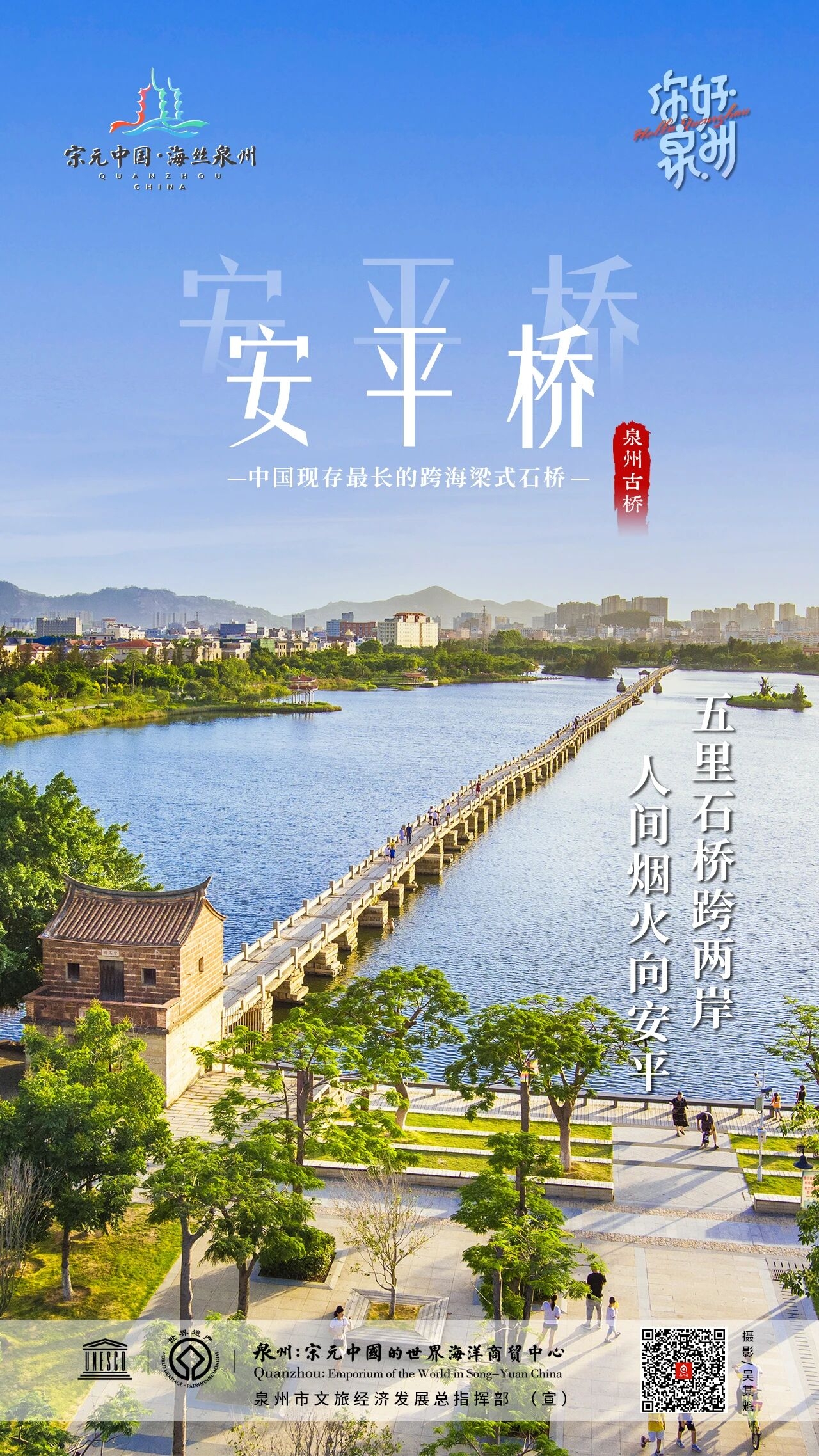 历经十三载披星戴月,安平桥跨江而立。它将汹涌浪潮化为坦途,把百姓的祈愿凝练成跨越百年的壮丽景致。361个桥墩如磐石挺立,撑起两地往来的通途;更以“天下最长石桥”“单体用石量第一”“唯一集三种桥墩形制于一身”,在中国桥梁史上书写下不朽传奇。