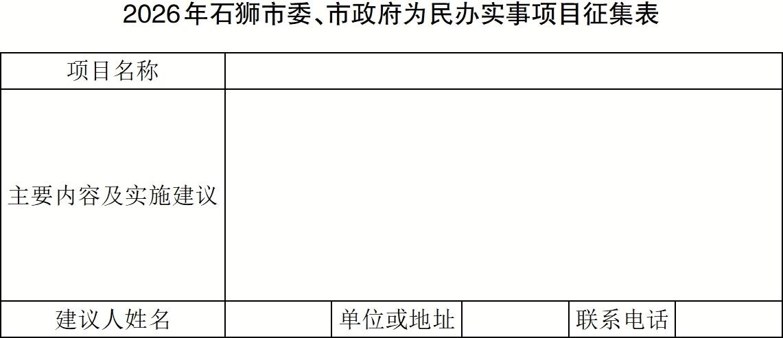您希望市委市政府明年为咱老百姓办哪些实事?今日,市委市政府在《石狮日报》刊登征集表,公开向广大市民和社会各界征集2026年为民办实事项目的意见和建议。希望大家积极建言献策,推荐实事项目,一起努力建设美丽的狮城。