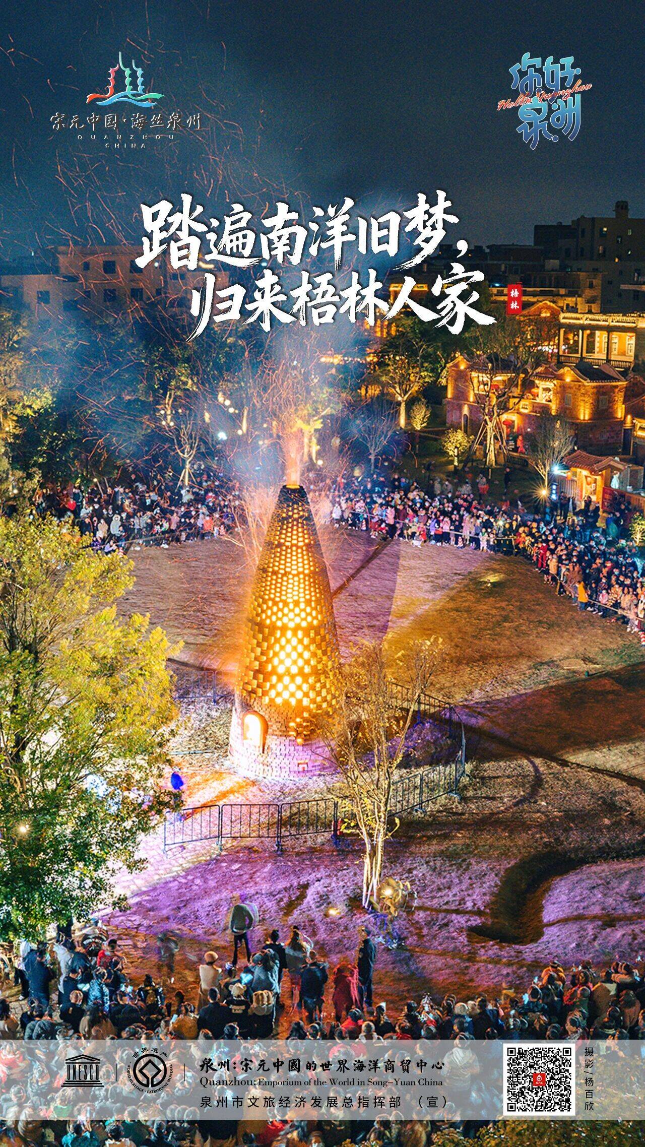 漫步今日梧林,历史在每一处细节中苏醒。罗马柱廊下传来《过番歌》的悠扬旋律,唱不尽闯荡南洋的艰辛与乡愁;《侨批往事》的沉浸演绎,让薄薄信笺承载的家国深情穿越时空。中秋烧塔的烈焰腾空而起,映照出闽南人炽热的生命之火;文那笔下的藏海厝,以艺术的语言诉说闽南人与大海千丝万缕的羁绊。这里,每一扇花窗都是文化对话的窗口,每一方砖雕都凝结着跨越海洋的智慧。