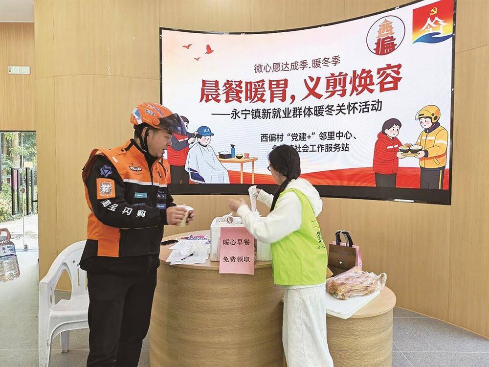 日前,永宁镇西偏村“党建+”邻里中心精心组织了以“义剪暖新心,服务伴前行”为主题的免费早餐、义剪公益行动,为奔波在一线的快递员、外卖骑手、网约车司机、直播从业者等新业态群体送上贴心服务。